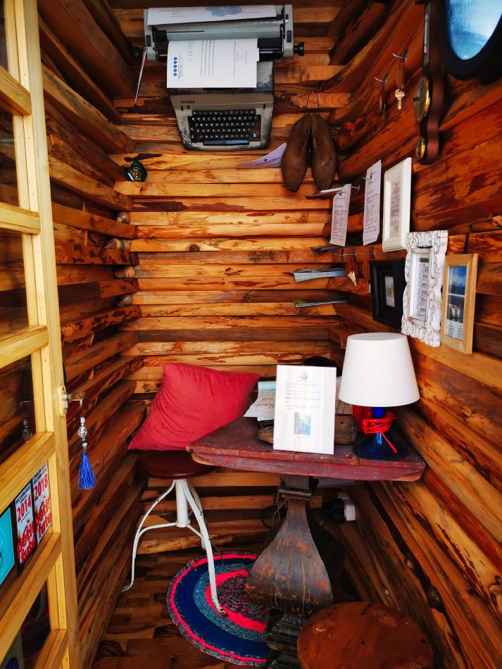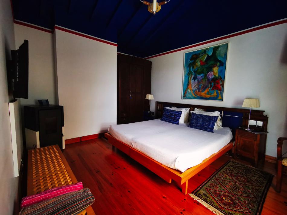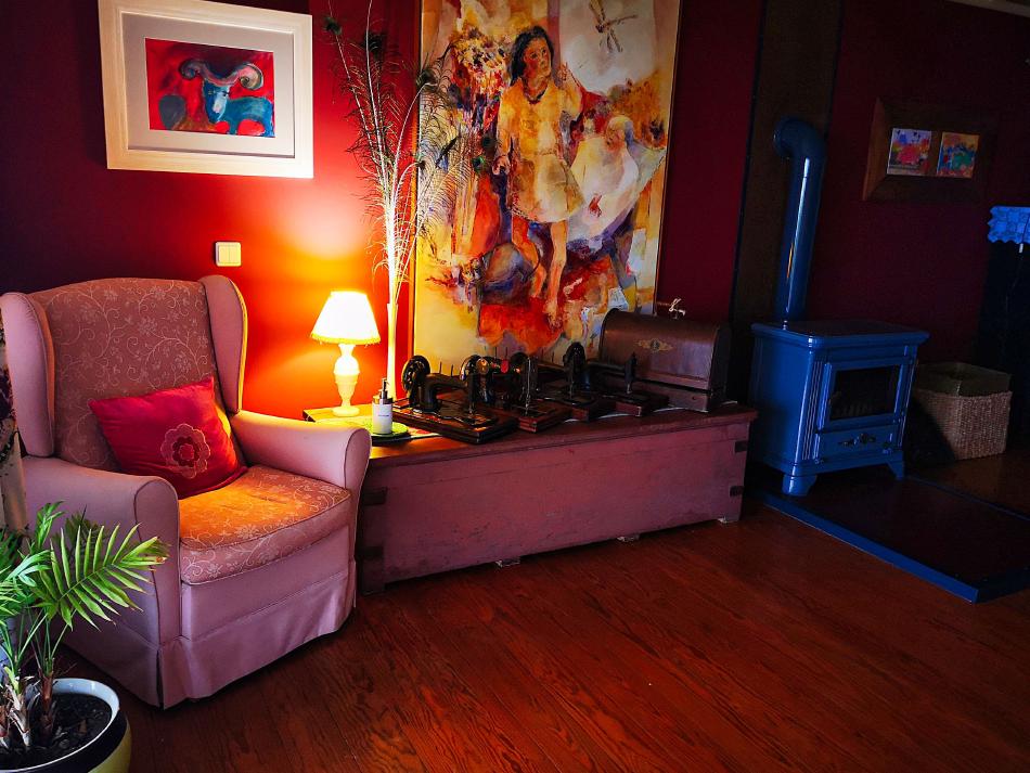 Vom Wohnbereich war durch eine Tür der Schlafbereich zu erreichen. Das Schlafzimmer war ziemlich großzügig. Hier gab es eine Bank, auf der wir zumindest einen unsere Koffer ausbreiten konnten, einen Sessel, natürlich das Bett, einen Ofen und in einer Nische einen Kleiderschrank. Die meisten Möbel in diesem Raum sahen tatsächlich nach Antiquitätengeschäft aus – passten hier aber ultimativ gut hin.