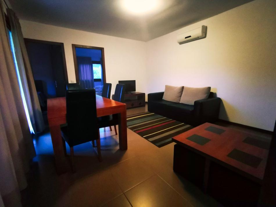Angrenzend an den Küchenbereich, der direkt vom Eingang in den Bungalow zu erreichen war, war ein großzügiger Wohnbereich mit Tisch und Stühlen und einer Couch. Über der Couch hing eine Klimaanlage. Platz für einen Couchtisch gab es hier zwar nicht, dafür gab es einen weiteren Tisch, den wir zumindest für einen unserer Koffer nutzten konnten.