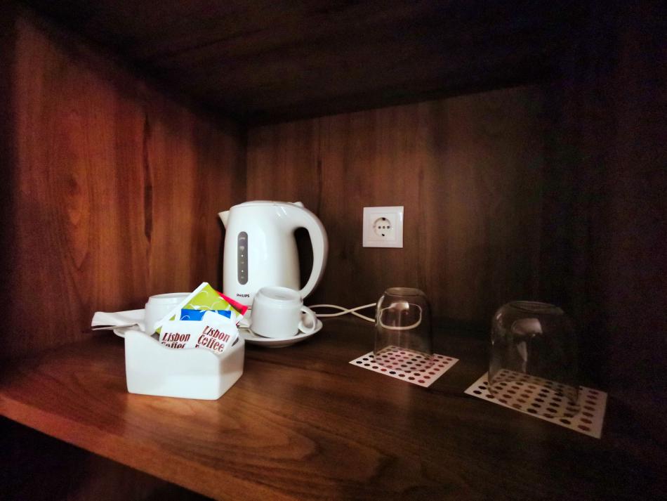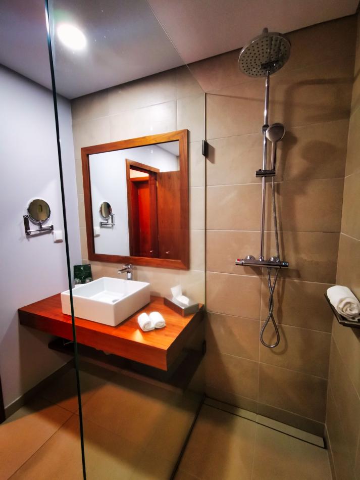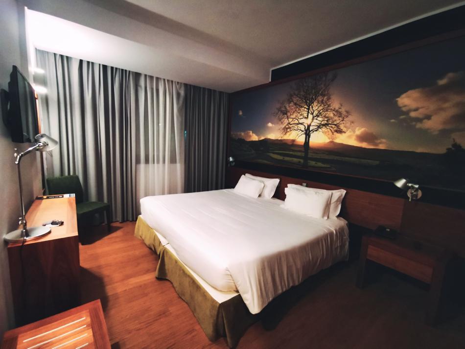 Das Hotel ist einheitlich in einem Wald/Holz-Design gehalten und so waren auch die Flure immer grün beleuchtet. Das hat uns auf dem Weg zu unserem Zimmer schon sehr begeistert. Wir hatten ein Standard Doppelzimmer mit Frühstück. Das Zimmer war mit Klimaanlage, großem Bett inkl. Kleiderschrankwand ausgestattet. Wir hatten in dieser Schrankwand einen Kühlschrank und einen Wasserkocher mit Tee.