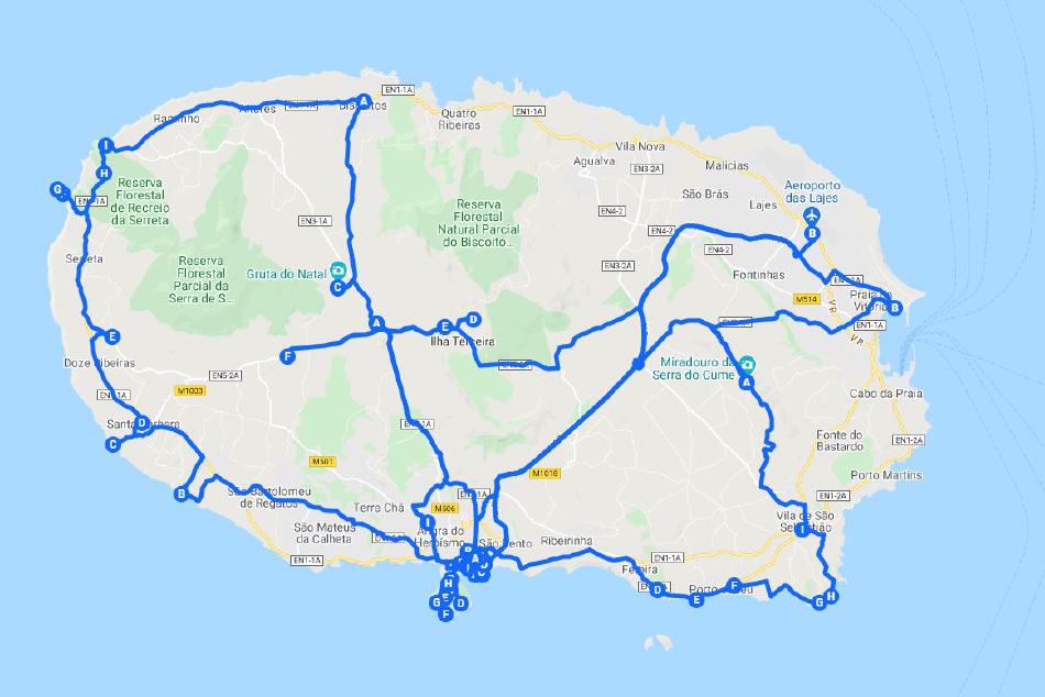 Terceira ist eine ziemlich große Insel mit gut ausgebauten Straßen und vielen kleinen Orten. Um die Insel herum führt eine sehr gut ausgebaute Hauptstraße und auch durch die Inselmitte führen diverse Straßen. Im Gegensatz zu den anderen Inseln, sind auch die Straßen in der Inselmitte sehr gut befahrbar; wenn auch (zumindest in den Naturschutzgebieten) meist durch hochgewachsenen Wald.
