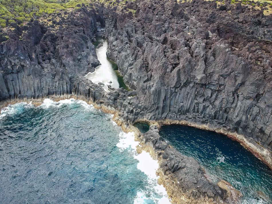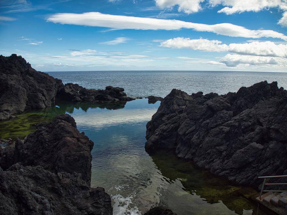 Die Klippenlandschaft hier ist wirklich klasse. Es gibt eine kleine Spalte, durch das das Meer fliest und einen langen Weg hin zu weiteren natürlichen Schwimmbecken, den Simão Dias, für die das Fajã auch bekannt ist. Wegen eben dieser Schwimmbecken ist der Weg durch die Klippen auch recht gut besucht, gänzlich allein waren wir hier immer nur für kurze Zeit. Wir fanden es immer wieder faszinierend, mit welchen Schuhwerk sowohl Touristen als auch die Einheimischen hier unterwegs waren. In Flip-Flops würden wir nicht über die spitzen Klippen laufen wollen…
