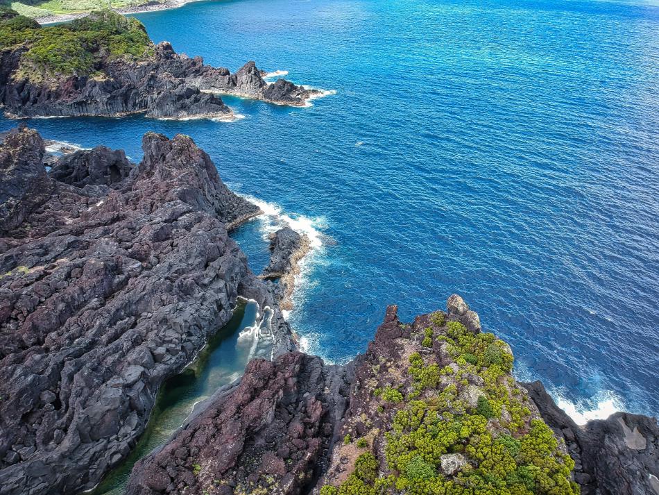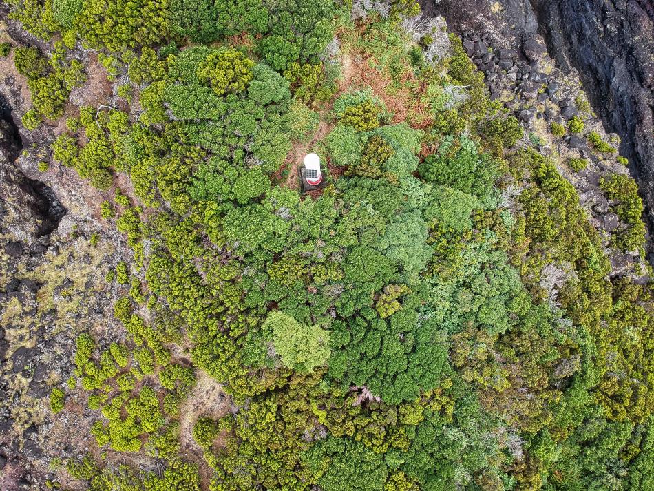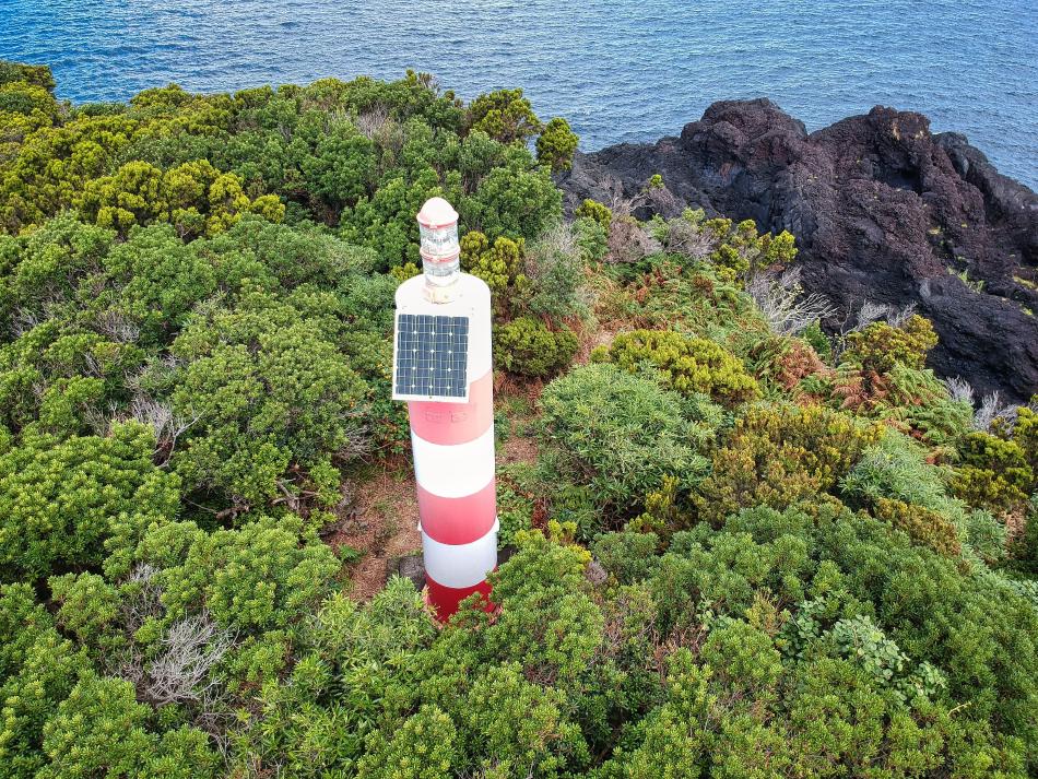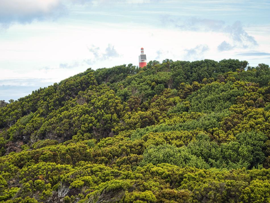 Von oben kann man sogar ziemlich eindeutig erkennen, in welche Richtung die Lava geflossen ist, die dieses Fajã erschaffen hat. Inmitten dieser schroffen Lavalandschaft hat sich über die Zeit ein breiter, grüner Streifen mit Bäumen gebildet, in dessen Mitte der Leuchtturm steht.