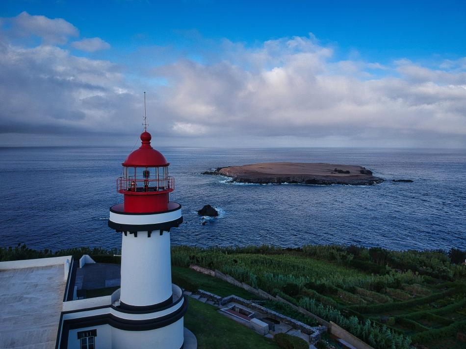 Auch vom Leuchtturm aus hatten wir eine tolle Sicht auf die Ilha do Topo. Unsere Drohnenakkus waren noch nicht ganz verflogen und so waren wir uns schnell einig, die Drohne ein letztes Mal für diesen Tag auszupacken, um noch ein paar tolle Bilder von Leuchtturm, Insel und Umgebung zu schießen.