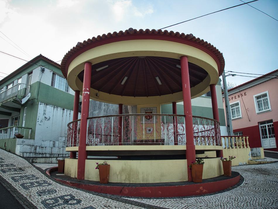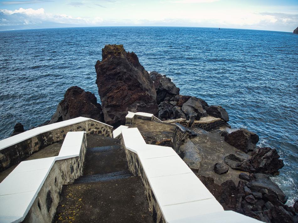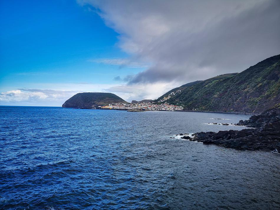 Direkt neben unserer Unterkunft gab es noch einen Aussichtspunkt, den wir natürlich auch nicht auslassen wollten. Bevor wir also aus dem Ort Queimada, in dem unsere Unterkunft lag, heraus gefahren sind, sind wir noch kurz die 30 Meter in Richtung Bucht gefahren, um uns hier einmal umzuschauen. Die Straße endet hier in einem kleinen Kreisverkehr, auf dessen Mitte ein Schild mit dem Text Miradouro do Carregadouro stand (Google Maps nennt diesen Ort jedoch Miradouro da Ponta de Queimada). Von hier aus hat man wirklich einen super Blick über die Bucht nach Velas – von hier eine Fähreinfahrt in Zeitraffer aufzunehmen wäre bestimmt klasse; haben wir aber irgendwie in dem Moment nicht dran gedacht.