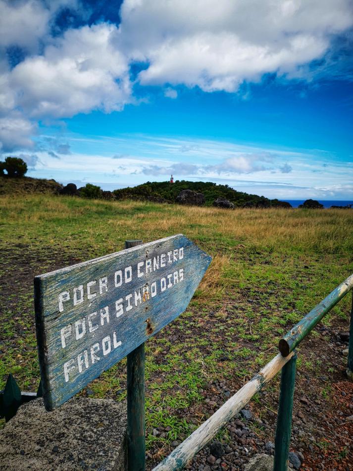 Der Hafen liegt im Osten des Fajãs, wobei die Nordküste auch nur ca. 100 m entfernt liegt. Hier in der Nordküste sollte es noch einen kleinen Leuchtturm geben, den wir uns noch anschauen wollten. Die paar Meter sind wir zu fuß die steile Straße hinauf gelaufen, um einen Weg in die Klippen des Fajãs zu finden, in denen sich der Leuchtturm laut der Karte befinden sollte. Kurz hinter zwei Gebäuden auf der rechten Seite gab es einen kleinen Weg, an dem auch ein Wegweiser zum Leuchtturm hing. Hier startete ein ganz gut ausgebauter Weg durch die imposante Klippenlandschaft des Fajãs.