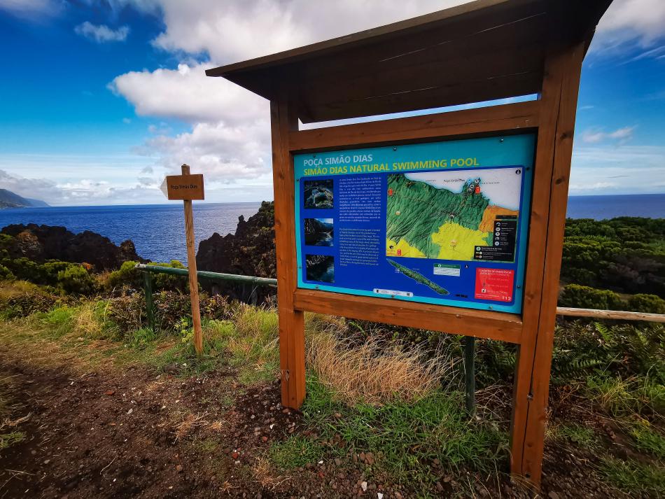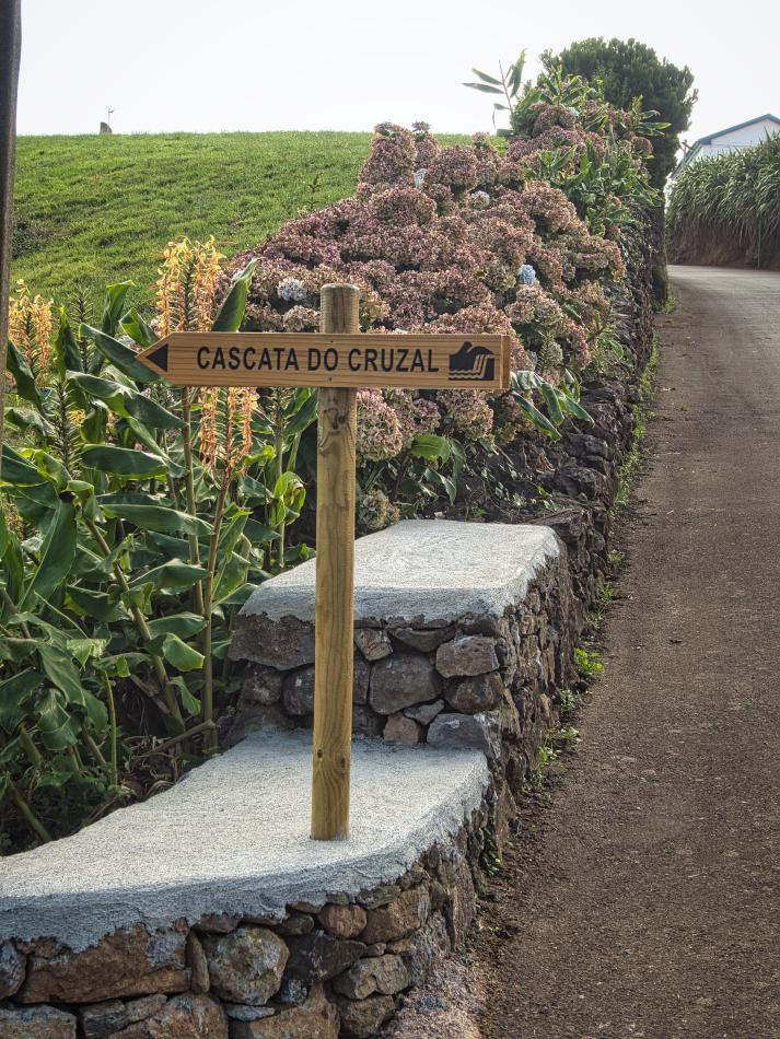 Als wir hier auf der kleinen Landzunge ankamen, haben wir uns aber wieder erst einmal nach Wegweisern ausschau gehalten. An einer Steinmauer gab es zwei große Schilder. Ein Schild wies den Weg zum CAMINHO DO ARCO nach links aus, ein anderes Schild CAMINHO DAS QUEBRADAS nach rechts. Bei ersterem, dem Caminho do Arco, handelt es sich wieder um eine Stelle in der Klippenlandschaft vor dem Fajã, die wir auch diesmal angesteuert sind. Aus dem kleinen Ort, der im Fajã liegt, führt eine Schotterstraße bis zur Küste, wo die Klippenlandschaft liegt.