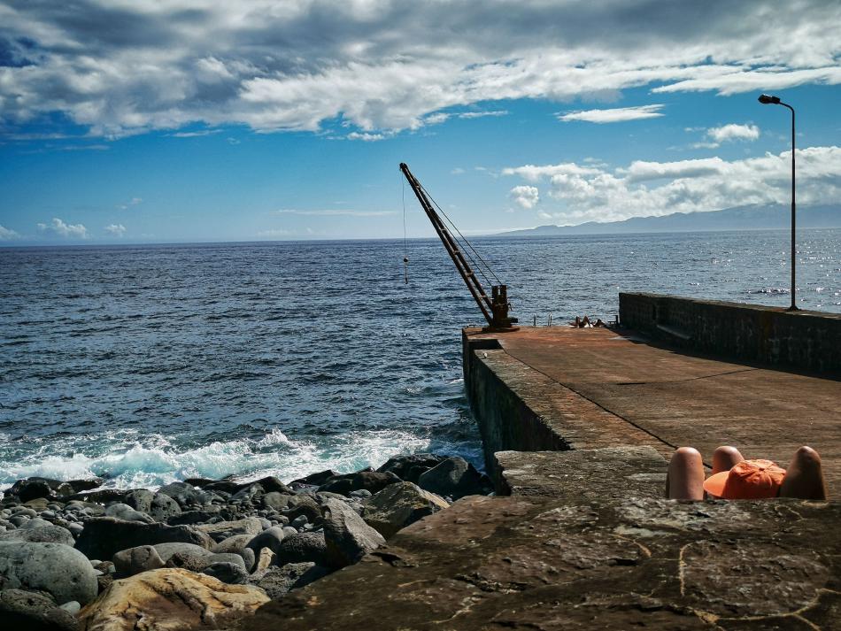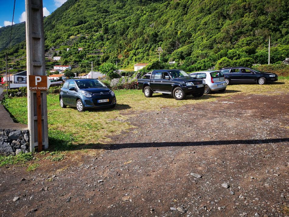 Als wir im Fajã angekommen sind, sind wir zunächst den größten Schildern gefolgt. Diese haben den Hafen ausgeschildert. Dieses Fajã ist übrigens eins der wenigen, in dem auch Google Maps die Straßen kennt. Am Hafen gab es einen kleinen Parkplatz, der um diese Uhrzeit, es war bereits 11:25 Uhr, schon ziemlich voll war. Eigentlich war der Parkplatz sogar schon voll, als wir hier waren, sodass wir uns schon auf eine Freifläche gestellt haben, die wir gar nicht richtig als Parkplatz wahrgenommen hatten. Das Fajã hier ist sowieso, wenn das, was man im Internet so liest, stimmt, eins der touristischsten Fajãs.