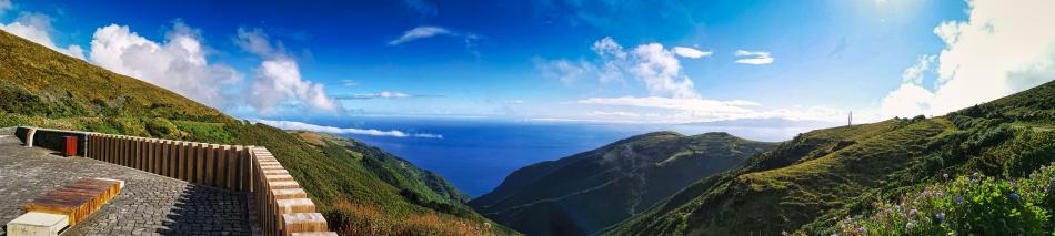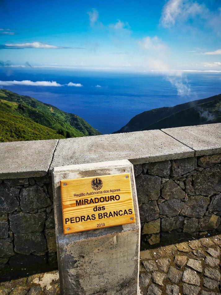 Auf dem Weg weiter nach Osten sind wir noch an einem weiteren, schön ausgebauten Miradouro vorbeigekommen, den wir vorher nicht auf dem Schirm hatten. Der erst 2019 gebaute Miradouro Pedras Brancas liegt zumindest für die Aussicht ein bisschen schöner, als der Serra do Topo. Hier konnten wir durch die weiten Täler zwischen den Bergen auf das blaue Meer schauen.