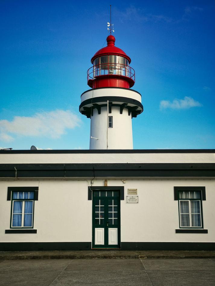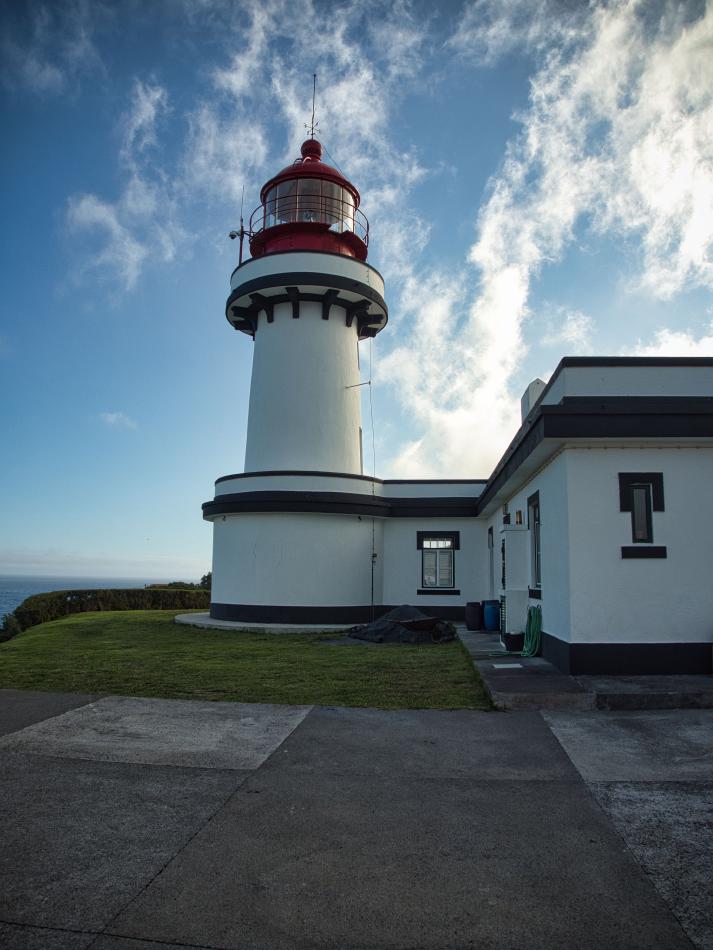 Das letzte Ziel des Tages war der Leuchtturm ganz im Osten von São Jorge. Vom Wasserfall aus ist die Insel bis zur östlichen Küste vergleichsweise dicht bewohnt. Bis zum Leuchtturm fuhren wir noch durch bzw. an 2-3 Orten vorbei, bis die Straße auf dem letzten Kilometer immer kleiner wurde und wir irgendwann auch einen Blick auf den Leuchtturm bekamen. An einer etwas abschüssigen Straße auf einer kleinen Erhöhung haben wir unser Auto kurz am Straßenrand abgestellt, um den ersten Blick auf den Leuchtturm einfangen zu können. Unmittelbar hinter dem Leuchtturm, im Meer, liegt eine kleine Insel, die genau wie der Ort heißt, in dem der Leuchtturm steht: Topo, beziehungsweise Ilha do Topo. Von hier oben sah der Leuchtturm eher unbedeutend im Vergleich zu der Insel aus, aber unser eigentliches Ziel war ja der Leuchtturm.