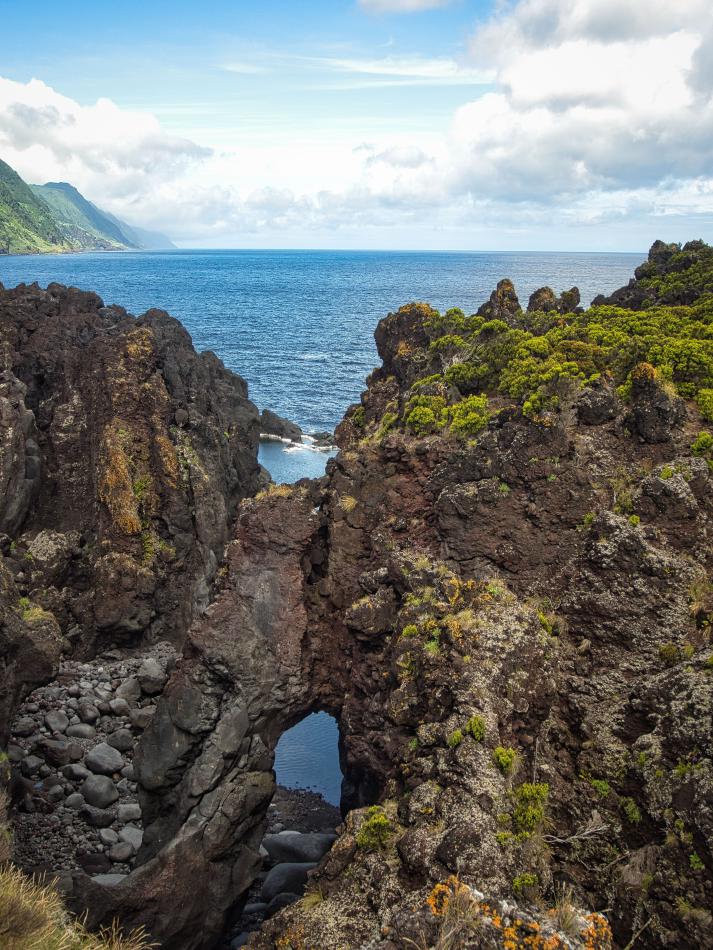 Das Fajã da Ribeira da Areia liegt insgesamt noch ein paar Meter tiefer als das Fajã do Ouvidor, sodass man hier in den Lavaklippen noch ein paar Meter näher am Wasser ist. Highlight der Lavaklippen hier ist ein großer Steinbogen, der im Wasser steht. Wir hatten richtig Glück mit dem Wetter, als wir hier waren: Das Wasser war türkisblau und total klar und der Bogen strahlte im Sonnenschein richtig. Dass solche Steinformationen natürlich auftreten, ist kaum vorstellbar.