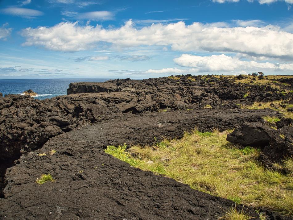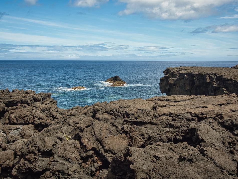 Die Lavalandschaft hier ist ziemlich weitläufig und man muss immer aufpassen, wo man hintritt, um nicht umzuknicken. Gerade stellen, an denen man normal stehen kann, sind eher rar und die Lavabrocken sind ziemlich spitz, sodass man besser nicht umfällt. Zu dem Steinbogen führt, das haben wir aber erst später gesehen, ein kleiner etwas ungefährlicherer Weg, über den man, ohne die Gefahr über einen großen Stein zu stolpern, laufen kann.