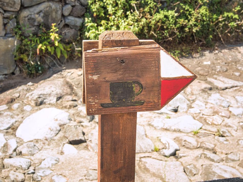 Das Café befindet sich auf der rechten Seite, direkt hinter einer Mini-Brücke und bietet einen großen Parkplatz, der vollkommen leer war, als wir ankamen. Hier ist schon alles Nett mit kleinen Wegweisern, die eine duftende Kaffeetasse zeigen, ausgeschildert. Das Café selbst liegt etwas in zweiter Reihe, sodass wir erst eine kurze Einfahrt hinein laufen mussten, um auf einen kleinen Hof zu gelangen, an dem das Café liegt.