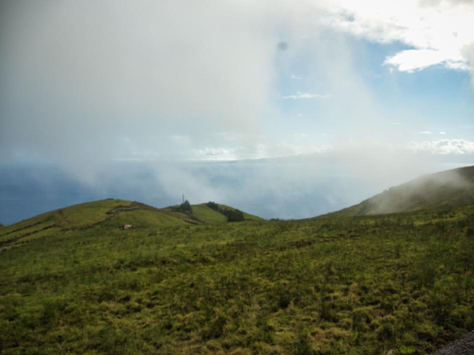 Der Weg aus dem Fajã dos Vimes heraus hat sich genau so gezogen, wie der Hinweg. Es gab tatsächlich nur einen einzigen Weg, der in das Fajã hinein führte, und der führte für uns genau in die falsche Richtung, nämlich nach Westen. Unser nächstes Ziel, ein Aussichtspunkt mitten auf dem Bergrücken in der Mitte von São Jorge, lag ungefähr auf der Höhe vom Fajã dos Vimes. Trotzdem haben wir wegen des weiten Bogens, den wir fahren mussten, für den Weg eine halbe Stunde gebraucht.