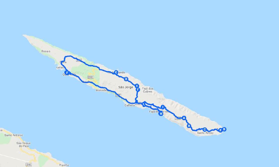 São Jorge besteht praktisch aus einem einzigen langgezogenen Bergrücken, an dessen Seiten die unzähligen Fajãs liegen. An diesem Tag wollten wir einige der besser zu erreichenden Fajãs besuchen, wobei die Routenplanung mithilfe von Google Maps praktisch gar nicht möglich war, da Google viele der kleinen Straßen, die in Serpentinen hinunter in die Fajãs führen, gar nicht kennt. Auf dieser Insel macht OpenStreetMap eindeutig einen viel besseren Job.