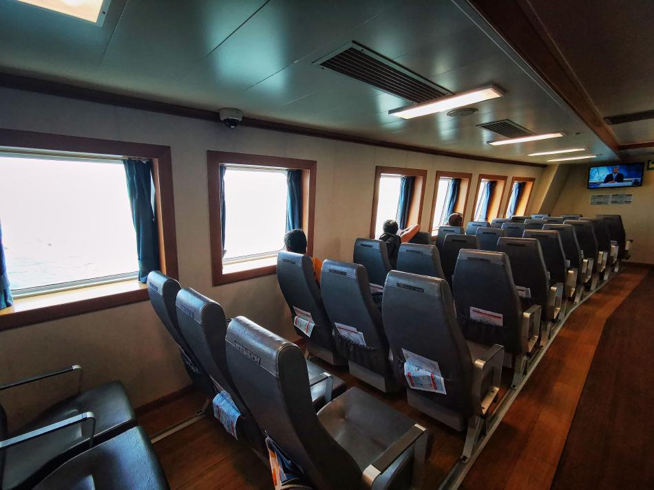 Auf diese Weise hatten wie die Gelegenheit uns die Fähre nochmal etwas weiter anzusehen. Bisher kannten wir nur das offene Deck oben. Hier stehen viele Plastikstühle, wovon die meisten auch überdacht sind. Unterhalb dieses Decks gibt es ein kleines wettergeschütztes Deck mit Tischen und Stühlen und einem winzigen Laden, der unter anderem Eis und Getränke verkaufte.