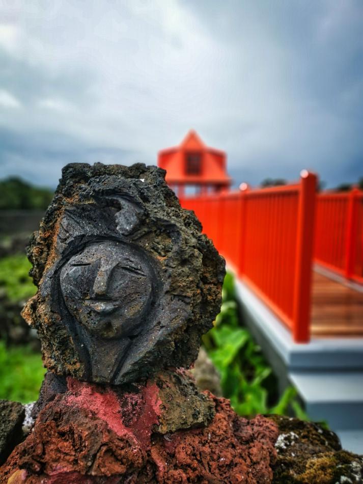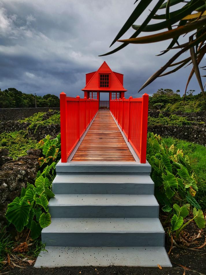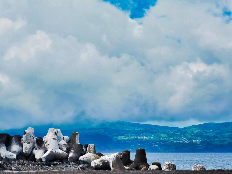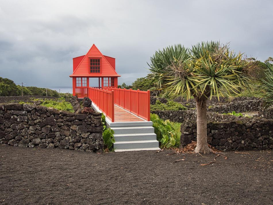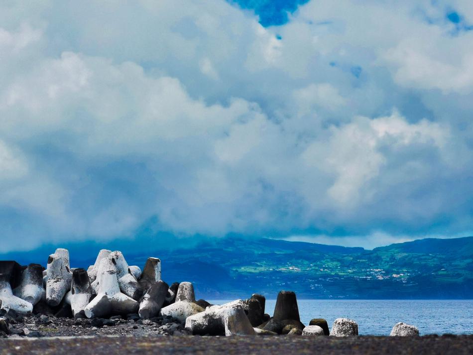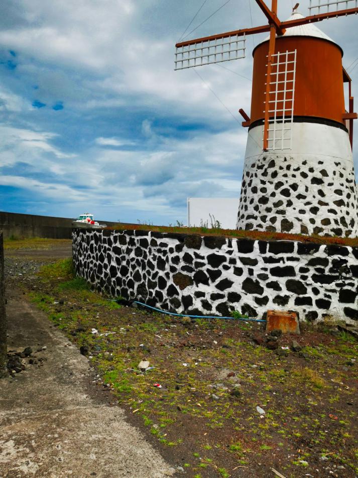Direkt angrenzend an dem Parkplatz stand eine kleine typisch azoreanische Windmühle. Das kleine Gebäude war noch ziemlich gut in Schuss und bevor wir wirklich mit unserer Rundreise über Pico gestartet sind, haben wir hier einfach schon einmal unsere ersten Fotos geschossen. Außerhalb der Mauern, die das Meer abgrenzten, gab es hier übrigens wieder ein Haufen von Wellenbrechern in Walflossenoptik und als wir den Blick noch weiter schweifen ließen, konnten wir in der Ferne auch São Jorge noch erkennen.