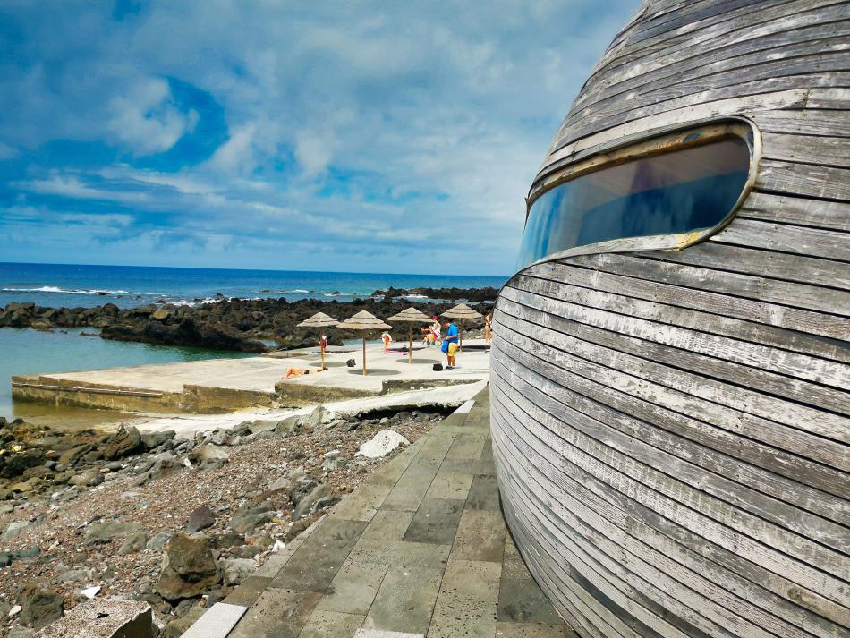 Wir hatten langsam aber sicher Hunger bekommen. Laura, die diese Insel vorbereitet hatte, hatte daraufhin direkt die Idee, zur nicht allzu weit entfernten Cella Bar zu fahren. Die Bar befindet sich nur einen Kilometer weiter die Küste herunter und ist ein einziges optisches und architektonisches Highlight. Angrenzend an das futuristisch anmutende Bar-Gebäude liegt einer der typischen betonierten Strände umgeben von Lavageröll, das als eine Art Wellenbrecher ein ruhigeres Schwimmbecken vor dem Strand formte.