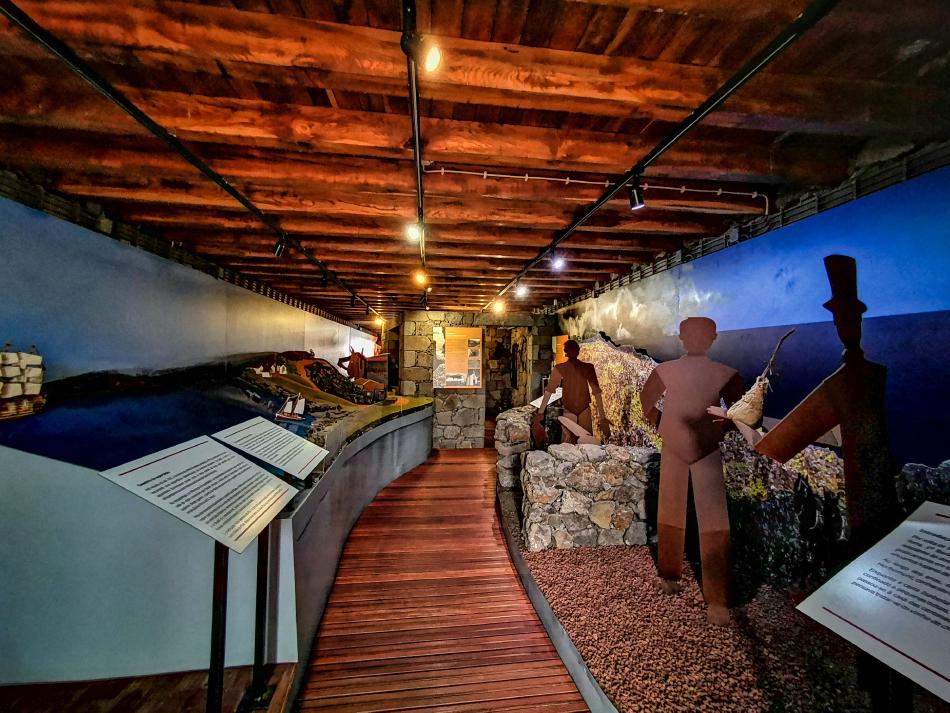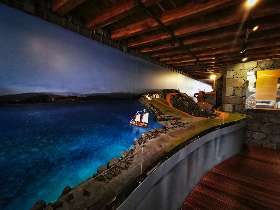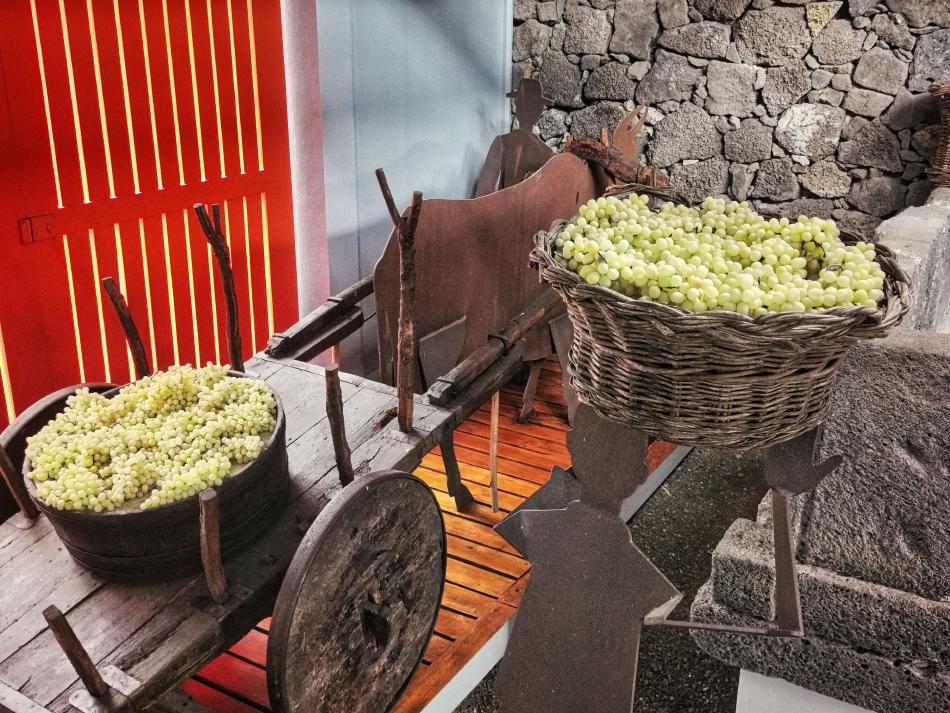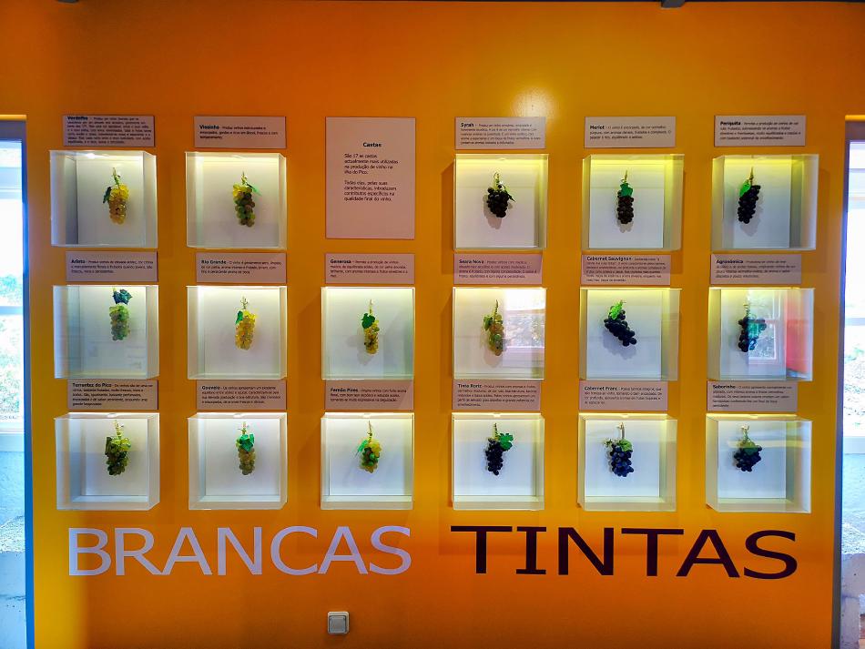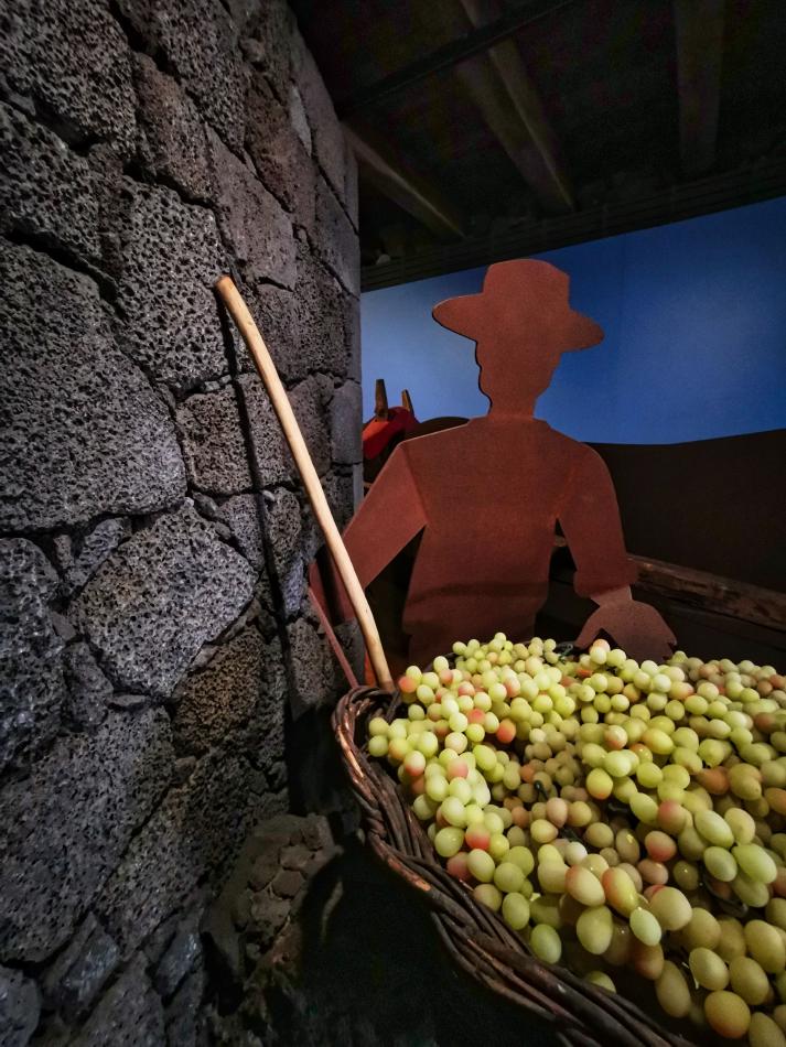 Nachdem wir die Aussicht aus dem Pavillion auf uns wirken lassen haben, haben wir uns noch weiter auf dem Hof umgesehen, bis wir in das Haupt-Ausstellungsgebäude hinein gegangen sind. Im oberen Teil ist ein langgezogener Bereich mit vielen Bildern und Informationstafeln an den Wänden. Unter anderem wird hier die Geschichte des Weins auf Pico erzählt und verschiedene Traubenarten vorgestellt. Ganz interessant war auch der Schnitt einer Weinrebe, also zu sehen, wie tief die Wurzeln einer Weinpflanze in den Boden reichen und wie klein die eigentliche Pflanze im Vergleich ist.