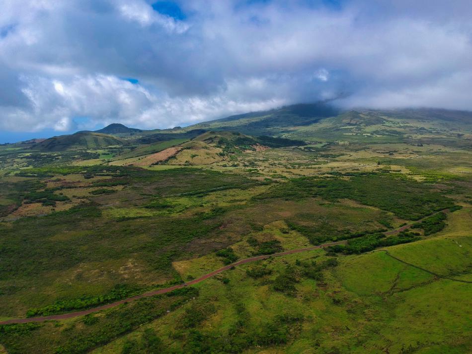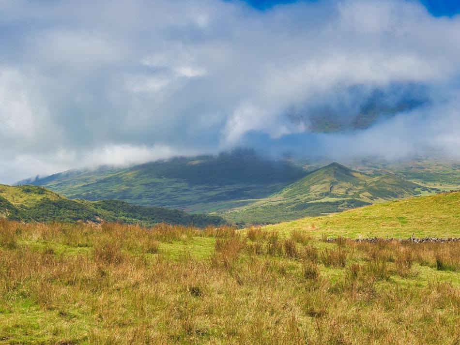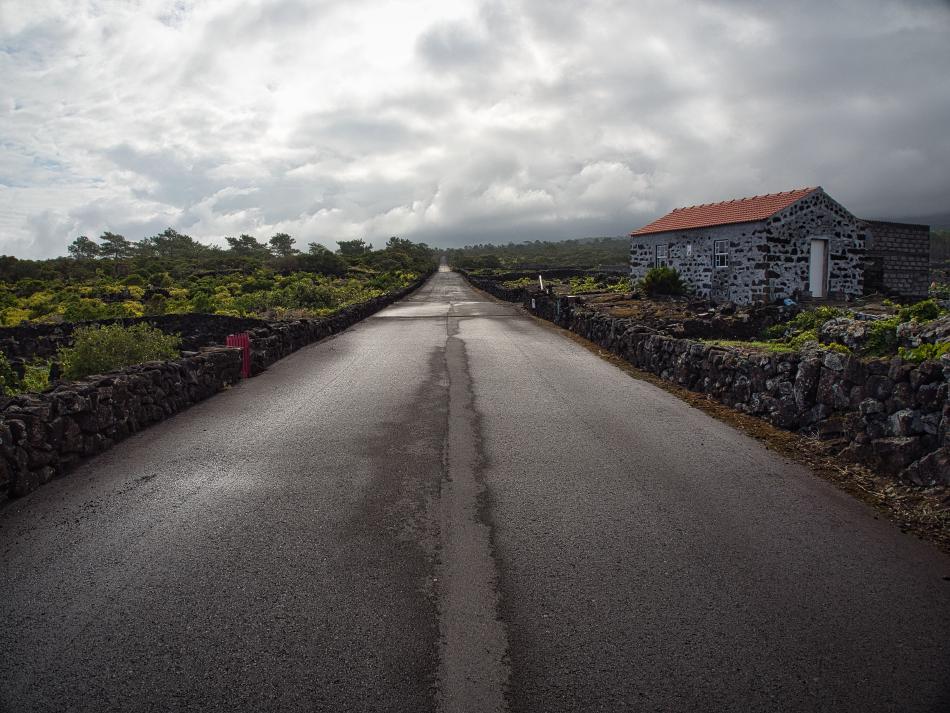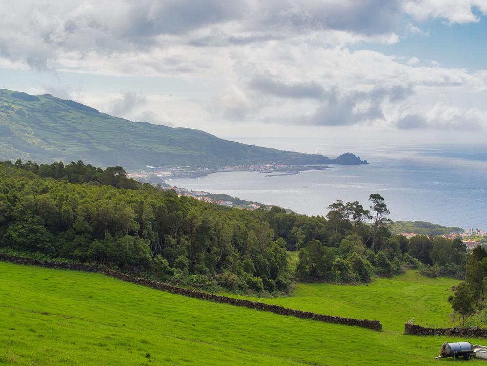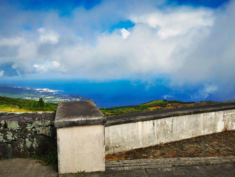 In Pico fährt man, ähnlich wie auch auf den meisten Azoreninseln, sobald man von der Küste in Richtung Inselinneres fährt, ein ganzes Stück den Berg hinauf. So war es auch hier, sodass wir rasch an Höhe gewonnen hatten. Ca. 10 km hinter São Roque erreichten wir einen größeren Miradouro auf der rechten Straßenseite, an dem wir eine kurze Pause gemacht haben. Die Sicht herunter auf São Roque war jedoch nicht so überzeugend, da just in dem Moment, als wir hier ankamen, dichte Wolken über diesen Teil der Insel zogen.