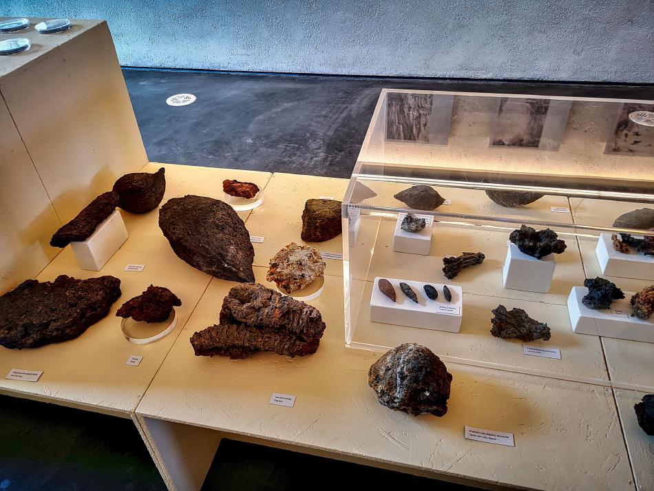 In dem sehr großzügigen Vorraum des eigentlichen Museums stand neben dem Shop-Bereich ein langer Tresen, an dem wir für zusammen 14 € unsere Eintrittskarten gekauft haben. In der Mitte dieses Vorraums stand bereits ein langer Tisch, auf dem verschiedenste Steine ausgestellt wurden, die hier in verschiedensten Schwarz- bis Gelb- und Rottönen schienen und die verschiedensten Formen aufwiesen. Auf der anderen Seite des Raumes, gegenüber vom Tresen, befand sich der Eingang in den Hauptraum des Ausstellung.