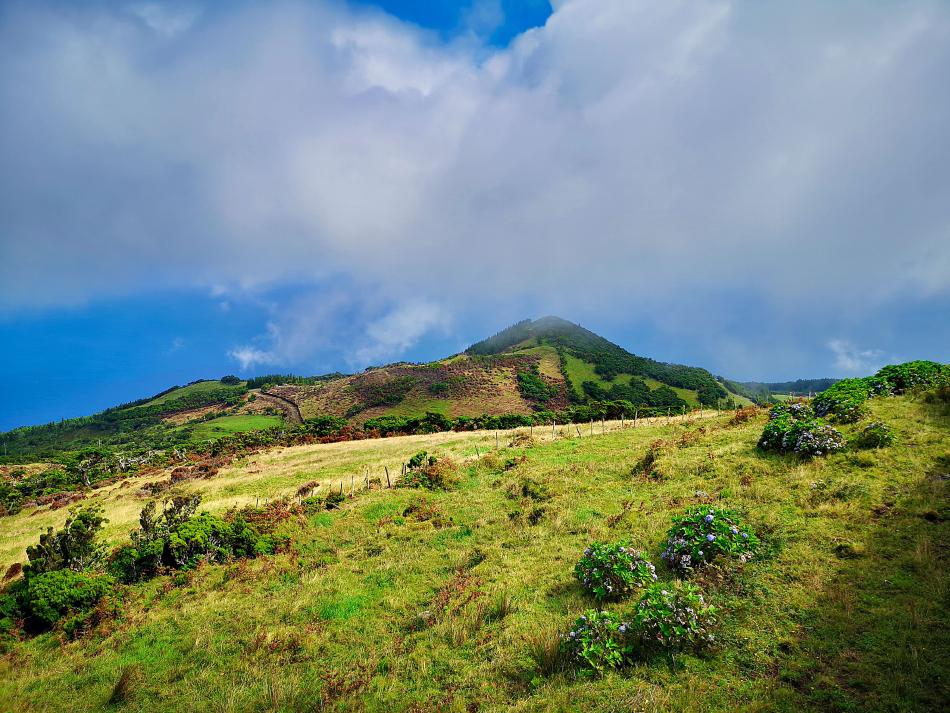 Auf dem Rückweg vom Lagoa do Capitão hatte unser Blick naturgemäß eine andere Richtung, als auf dem Hinweg. Als wir hier in Richtung Süden schauten, fiel uns erst auf, was für einen tollen Blick wir von hier aus auf den Berg hatten, der der Insel ihren Namen gibt: den Pico. Bevor wir es uns also auf unseren Autositzen bequem machen konnten, sind wir noch einmal aus dem Auto gesprungen, um ein paar Aufnahmen des ringsherum mit Wolken bedeckten Berges zu machen. Nur die Spitze des Berges lukte aus der Wolkendecke heraus.