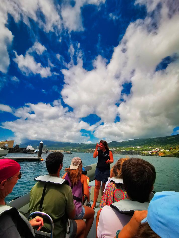 Die Ausflugsleiterin hatte ab hier einen harten Job, weil sie im Prinzip alles auf drei Sprachen wiederholen musste. Im Boot saßen nämlich nun vier Portugiesen mit Kindern (die wir nicht kannten), drei Deutsche (wir beiden + einer der beiden Deutschen, die wir schon aus Faial kannten) und eine Belgierin (die wir aus unser aktuellen Unterkunft kannten).