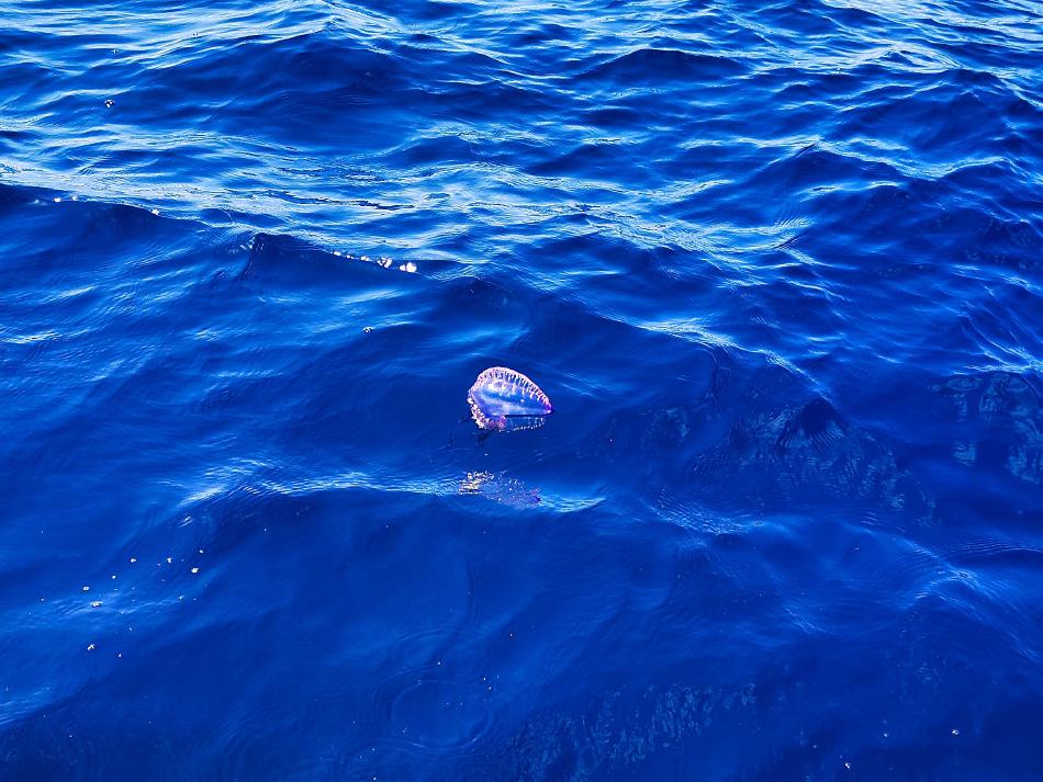 Auf der Fahrt sind wir auch an einigen portugiesichen Galeeren vorbei gekommen. Unsere Ausflugsleiterin hat uns dabei noch ein paar interessante Dinge über die hochgiftigen Quallen erzählt; zum Beispiel, dass die Tiere ihre Tentakel bis zu 30 m lang ausfahren können und dass dieses Lebewesen eigentlich aus drei individuellen Organismen besteht, die jeweils nur im Verbund überlebensfähig sind. Währen sie das erzählte, hatte sie eine Galeere an dem der großen Luftblase, die sie als Segel verwendet, gepackt und über dem Wasser hoch gehalten, sodass alle das Tier sehen konnten. Während das Tier außerhalb des Wassers hing, konnte man richtig sehen, wie es die Tentakel weiter ausfuhr, um weiter im Wasser zu bleiben. Als unsere Ausflugsleiterin mit ihren Infos durch war, warf sie das Tier wieder zurück ins Wasser.