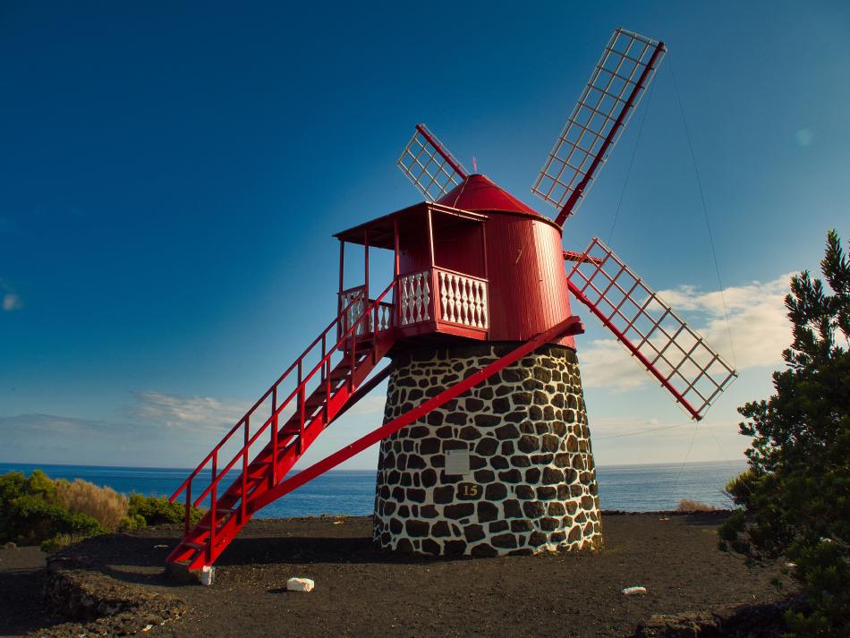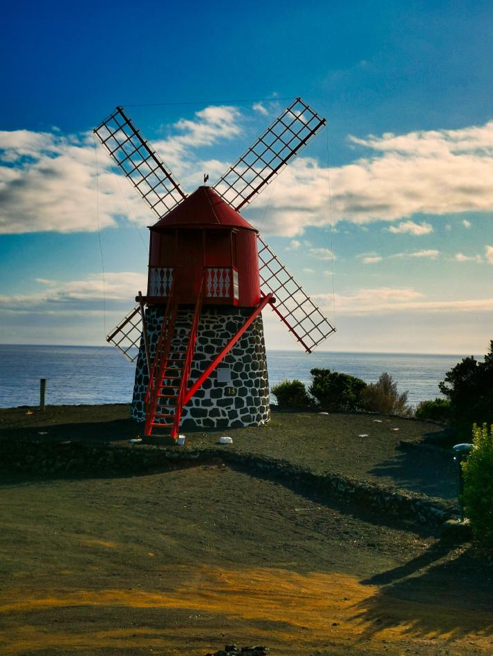 Auf dem Rückweg wollten wir nicht einfach den gleichen Weg nehmen, wie auf dem Hinweg, sodass wir dieses Mal an der Küste entlang zurück nach Madalena gefahren sind. Auf diesem Weg lag, kurz vor dem Ort São João, noch eine nette Windmühle auf der Meerseite. Wir hatten diese Windmühle sowieso auf dem Plan und nun, wo wir sowieso daran vorbei fuhren, sind wir einfach direkt angehalten.