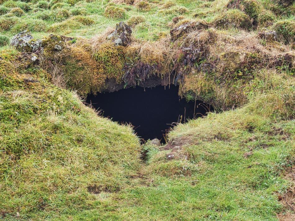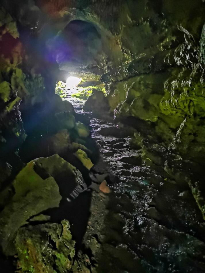 Unten im Loch angekommen, gab es nach links eine große dunkle Höhle. Einen großen Schritt, und schon stand Paul mitten in der Höhle mit dunkelgrün bewachsenen Wänden und großen Steinen auf dem unebenen Boden. Hier musste man schon etwas aufpassen, wo man hintritt, eine (Handy-)Taschenlampe ist schon das mindeste, was man dabei haben sollte!