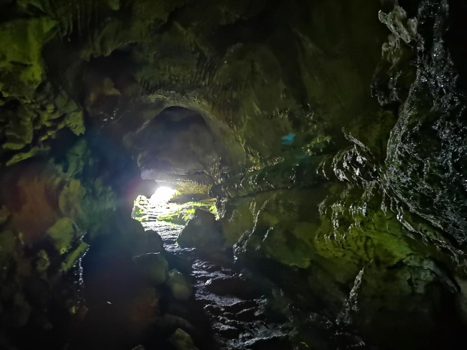In den ersten Minuten unserer Führung ging es vom Vorraum aus in einen kleineren Raum mit Stühlen und einem Fernseher, auf dem ein Einführungsfilm zur Höhle gezeigt wurde. Hier gab es einige Infos, wie die Höhle entstanden ist (abströmende Lava, die Hohlräume hinterlassen hat) und dass es unzählige dieser Höhlen auf diesen Vulkanischen Inseln gäbe. Zudem wurde erklärt, dass an den Höhlenwänden einzigartige Mikroorganismen leben, die es sonst nirgends auf der Welt gäbe und man die Wände deshalb unter keinen Umständen anfassen sollte, um die Organismen nicht zu gefährden.