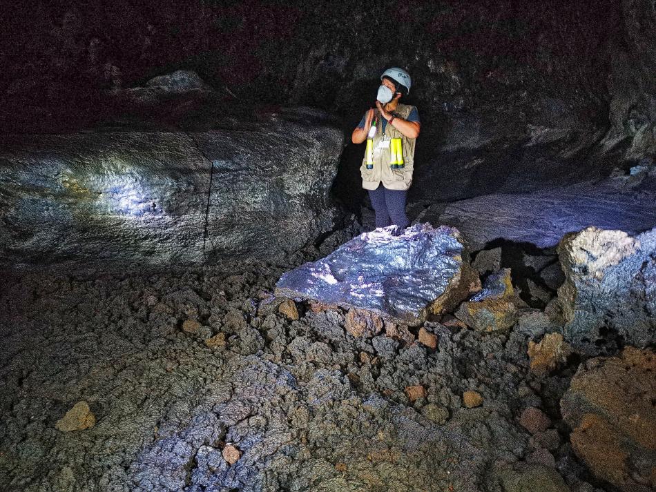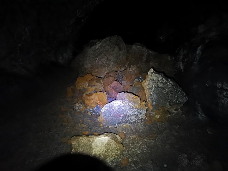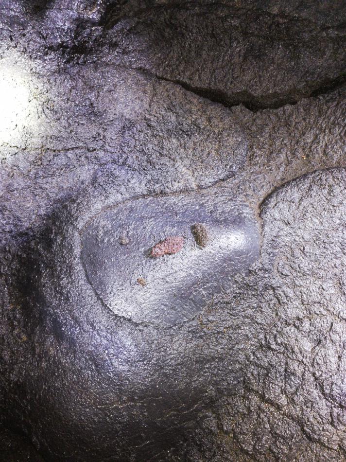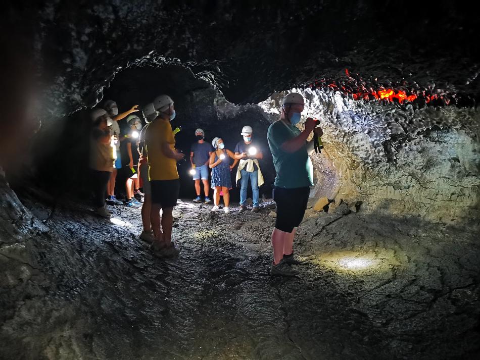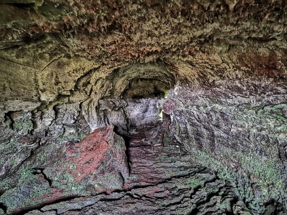 Irgendwann endete der Betonsockel und wir liefen über eine Stufe auf den rauen, unebenen Lavaboden. Hier hat uns die Führerin noch einmal genau gezeigt welcher Boden bei welchen Lavaströmen entsteht und anhand verschiedener Beispiele hier in der Höhle gezeigt, wie das ganze aussieht.