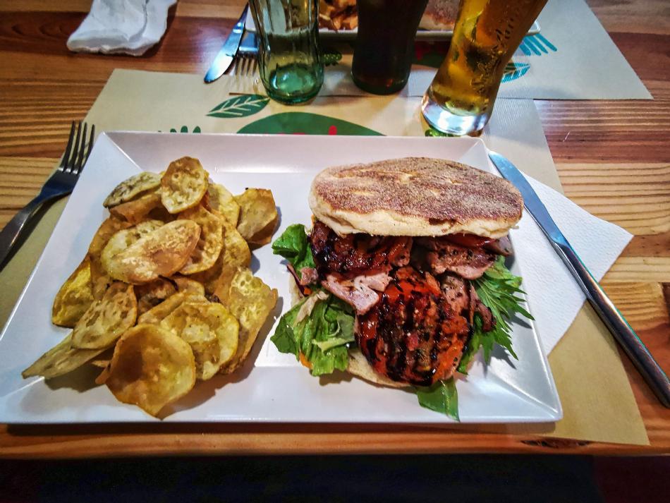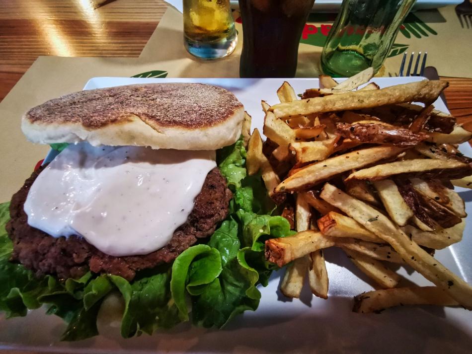 Wir haben zunächst richtig leckeres (aber starkes!) Knoblauchbrot und dann einen Burger bestellt. Laura hatte selbst geschnitzte Pommes und Paul chipsartige Pommes als Beilage bekommen. Das Essen war richtig gut und super frisch. Da wir hier die einzigen Essensgäste waren, konnte hier auch kein fertiges Essen auf seine Auslieferung warten, sondern musste frisch zubereitet werden.