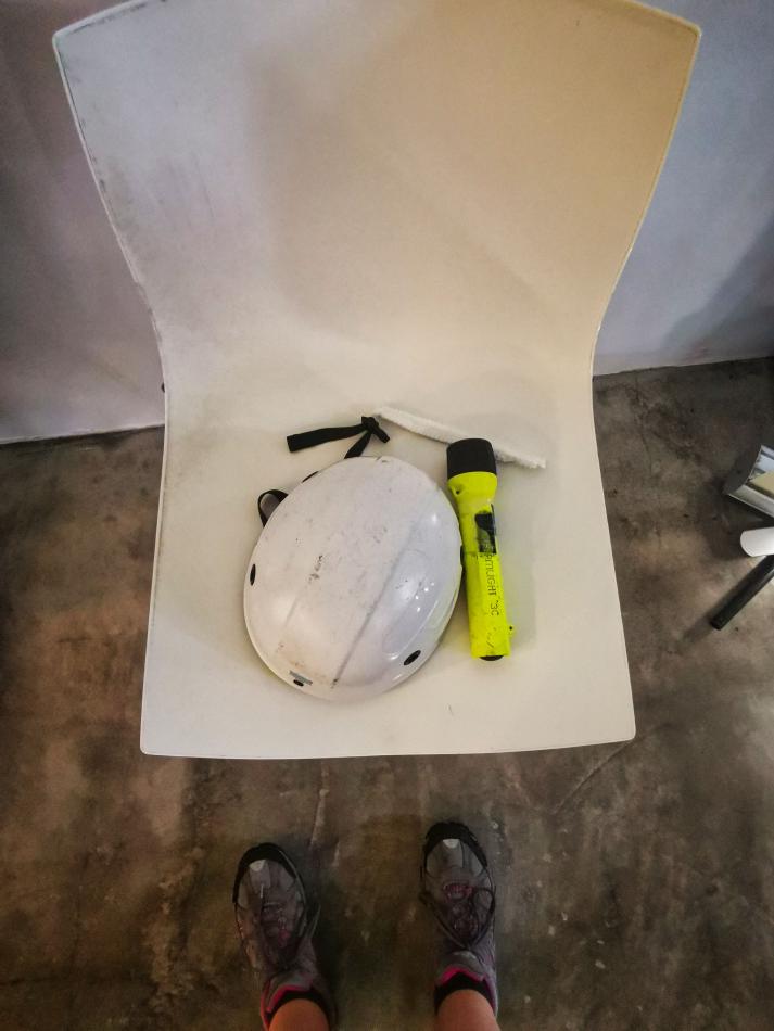 Hier sitzend wurden wir mit Haarnetzen und Helmen und mit Taschenlampen ausgestattet, da es in der Höhle keine Lampen gibt. Ungefähr 5 Minuten nach dem Film kamen auch die Niederländer mit ihren frisch gekauften Masken zurück und konnten mit uns die Höhlenführung starten.