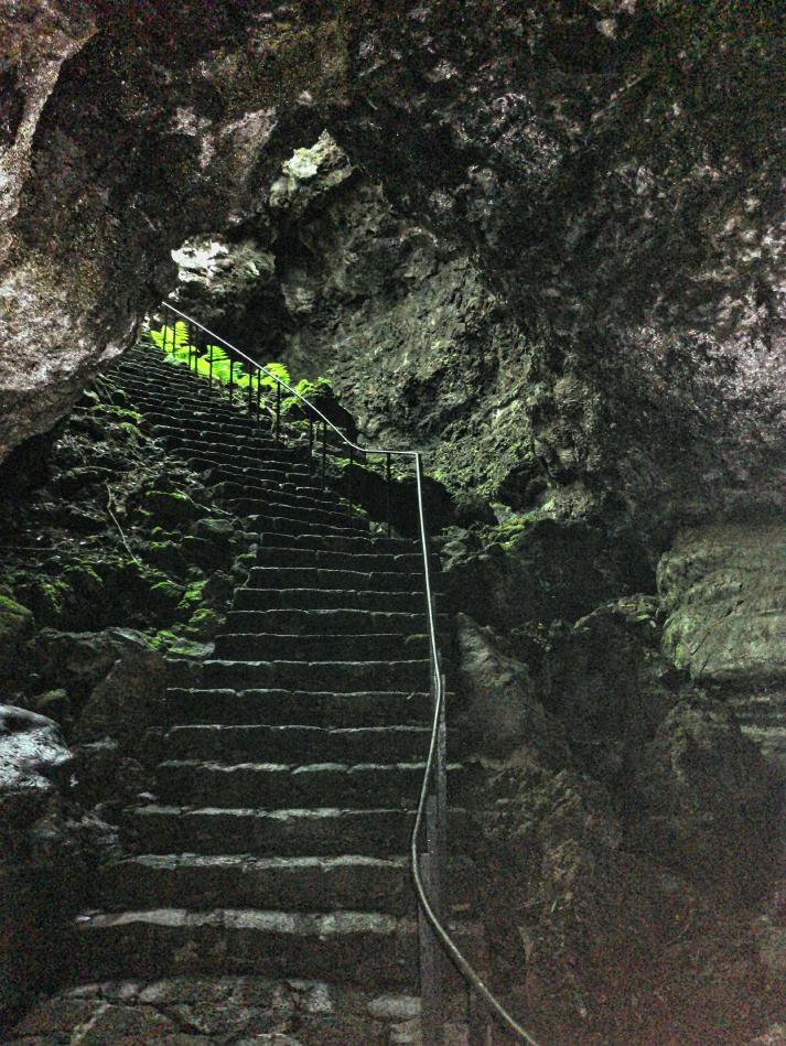 Wie so häufig begann der Weg in die Höhle mit einer langen Treppe nach unten. Je tiefer die Treppe nach unten führte, desto dunkler wurde es und irgendwann machte es schon wirklich Sinn, die Taschenlampen anzumachen. Die Treppe endete unten auf einem Betonsockel in der Höhle. Von hier aus konnten wir an den Höhlenwänden schon den grünen Schleier der besagten Mikroorganismen erkennen. Unsere Guidin hat uns noch einmal erklärt, dass die Mikroorganismen bis heute noch aktiv erforscht werden und wir immer noch nicht alles von ihnen wissen. Es scheint offenbar noch nicht einmal klar zu sein, ob sie giftig sind. Das Englisch unserer Führerin konnte man übrigens sehr gut verstehen.