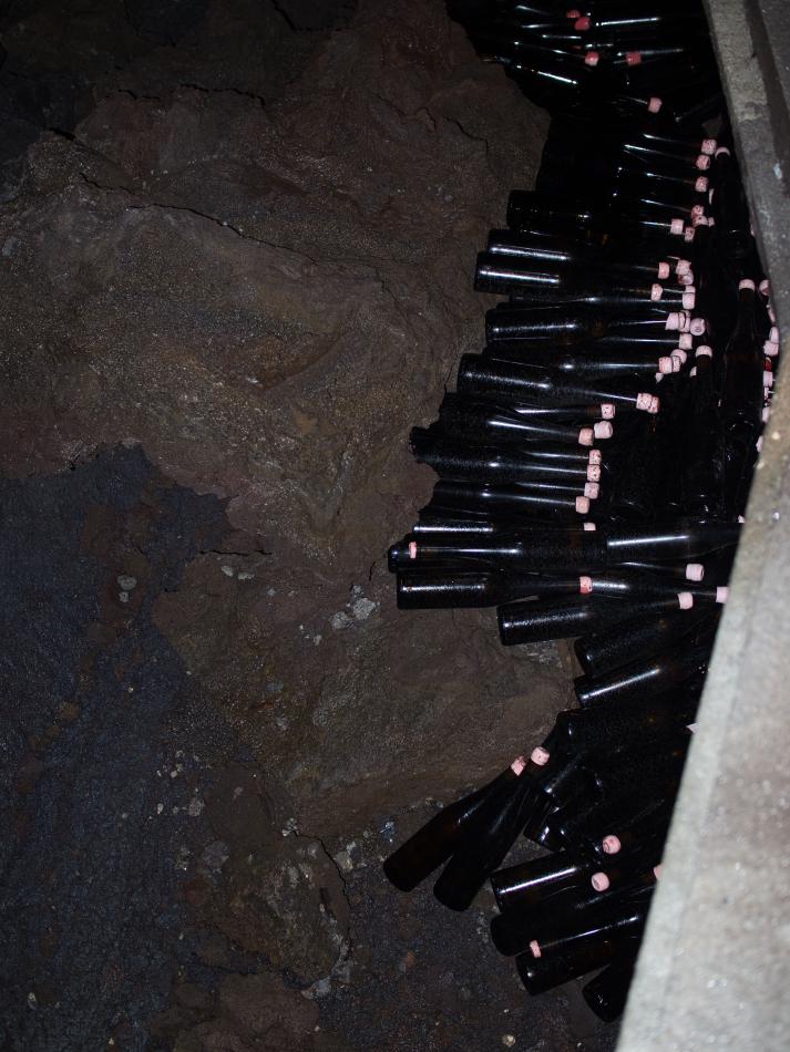 Beim Herausgehen fielen uns noch einige Flaschen auf dem Boden neben der Betonplattform am Beginn der Höhle auf. Auf Nachfrage erklärte die Mitarbeiterin uns, dass dies lokaler Wein sei und die Kelterer immer wieder mit ihrem Wein experimentieren. Ein aktuelles Experiment sei wohl die Lagerung des Weines in Höhlen.