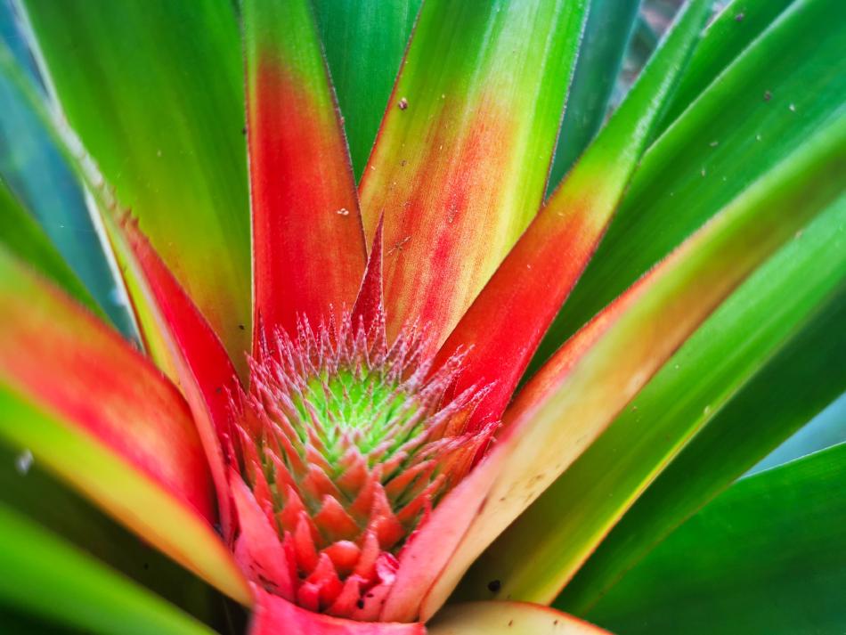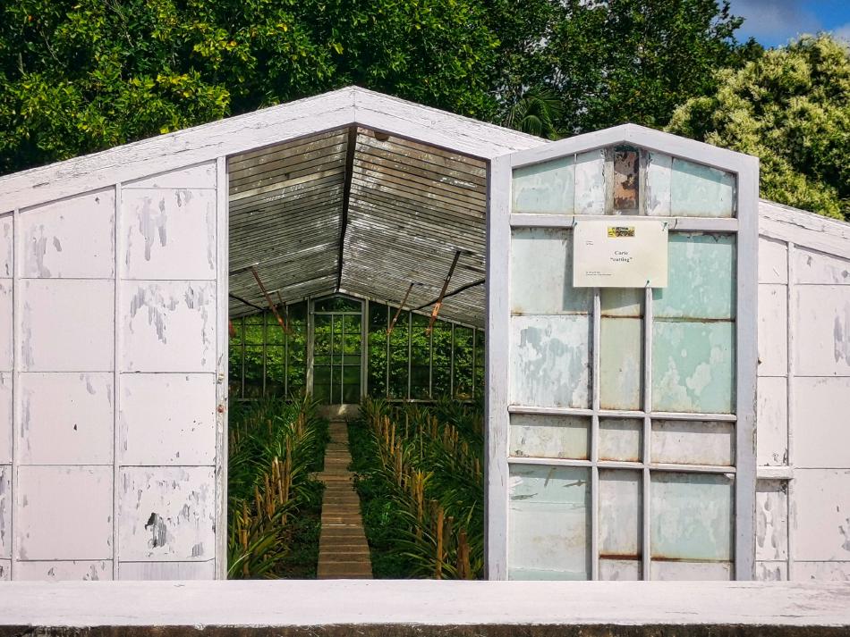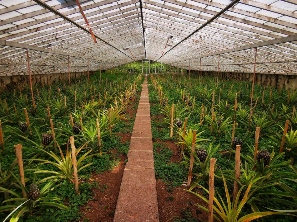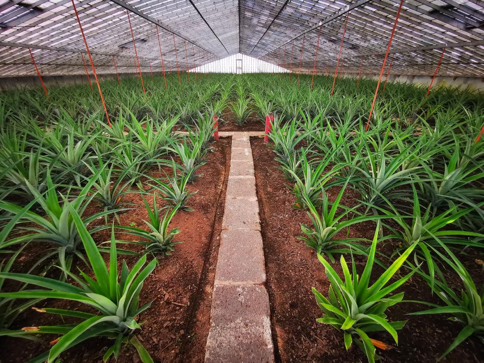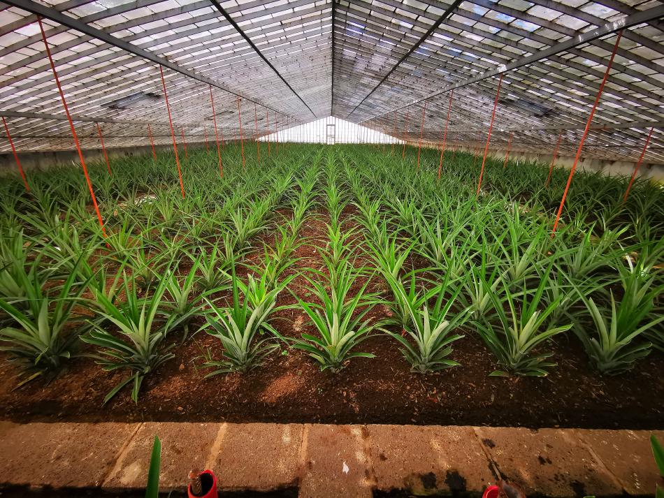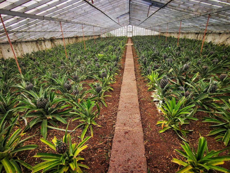 Zur Ananasplantage gehörte ein großes, rosanes Gebäude mit einem großen “SANTO ANTÓNIO” Schriftzug, das direkt am Parkplatz lag. Hier drinnen gab es einen Shop mit einem Mitarbeiter, der uns direkt mit auf eine kleine Führung mitnahm. Gemeinsam mit 4 anderen Leuten sind wir kurz auf die andere Straßenseite der kaum befahrenen Straße gelaufen, wo die vielen großen Gewächshäuser der Santo António Plantage standen. Hier hat uns der Mitarbeiter die Pflanzen im verschiedenen Wachstumsstadium gezeigt und erklärt, was wann mit den Pflanzen gemacht werden muss, damit sie gut gedeihen. Die Pflanzen brauchen zum Beispiel ein ziemlich konstantes Klima, das sie hier in den Gewächshäusern aufrechterhalten können – in der Decke gab es unzählige Fenster und das ganze Glas war mit einer dicken Kalkschicht beschmiert, um etwas von der Sonnenhitze zu reflektieren. Die Luftfeuchtigkeit in den Gewächshäusern ist aber richtig enorm, insgesamt richtig tropisch dort drinnen!