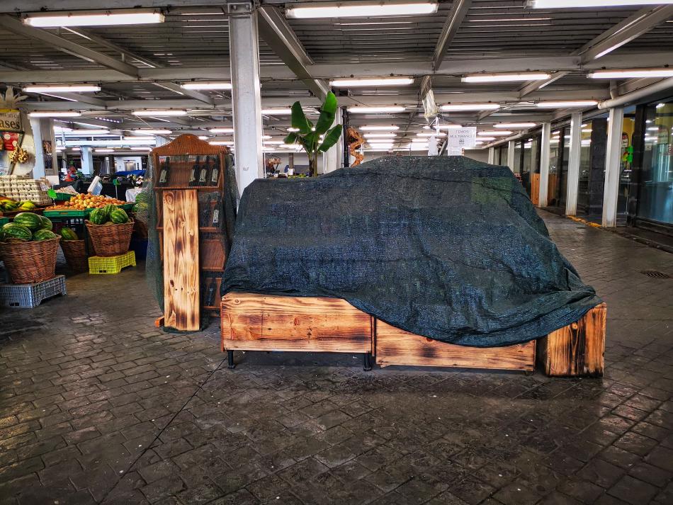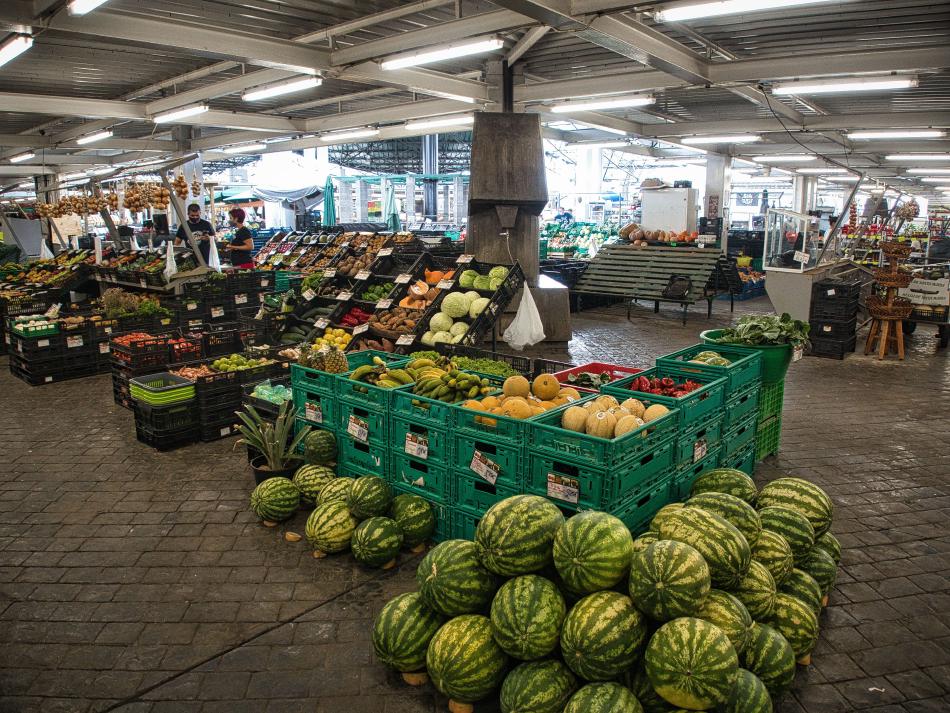 Der Markt war nicht mehr richtig voll, als wir hier waren. Das kann sowohl damit zusammenhängen, dass es bereits 14:30 Uhr war – oder tatsächlich auch mit den COVID-19-Schutzmaßnahmen. Die Ecke mit dem Fisch wurde bereits sauber gemacht, als wir hier ankamen, dafür waren wir definitiv zu spät. Es war trotzdem noch genug los, um etwas von der Atmosphäre einsaugen zu können, das viele frische Obst und die selbstgemachten Marmeladen und Saucen zu sehen und auch eine Idee davon zu bekommen, wie viel hier sonst los sein könnte. Die Gänge und die vielen leeren Standflächen ließen noch viel Kapazität frei.