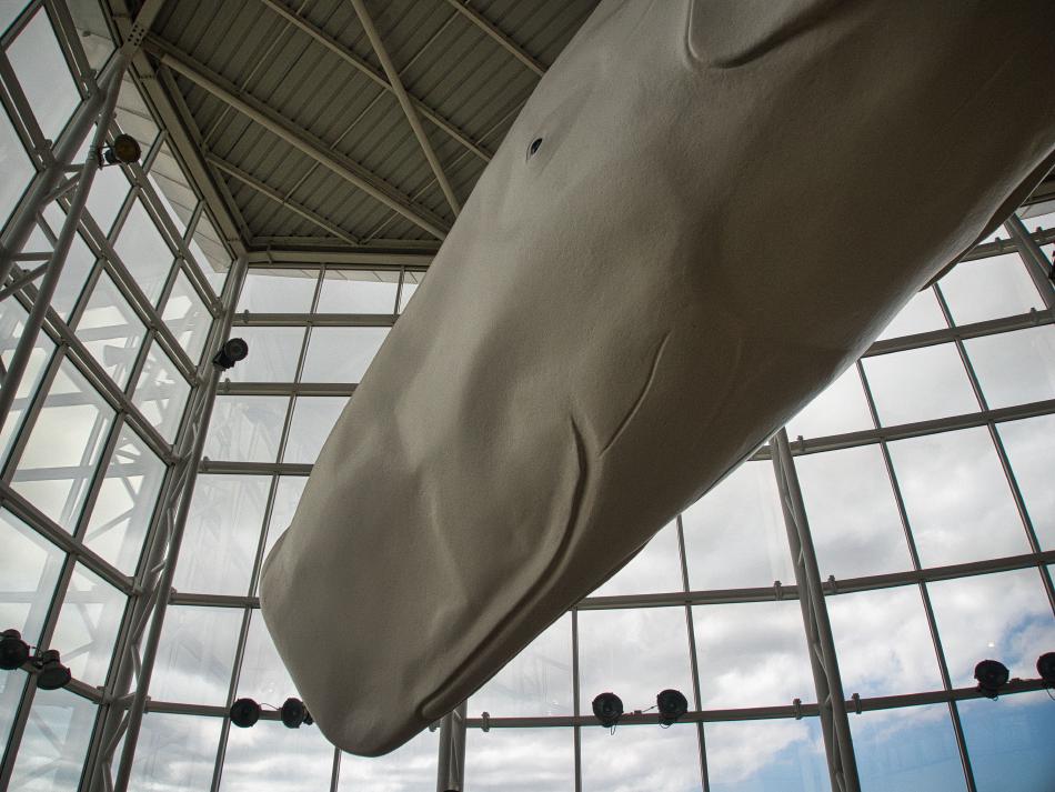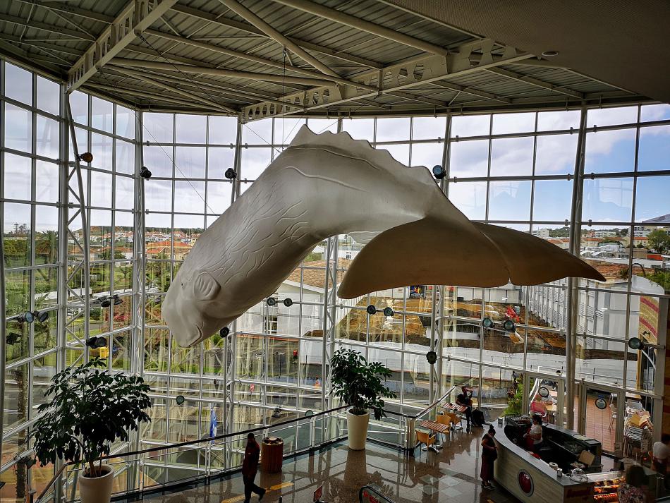 Von hier aus sind wir dann mit dem Aufzug hinauf gefahren – als erstes zu den Toiletten im Obergeschoss. Hier im Obergeschoss konnte man schon von oben eine riesige Wal-Statue erkennen, die hier über den Rolltreppen von der Decke hing. Das mussten wir auf jeden Fall später noch einmal von unten sehen!