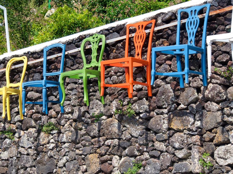 Auf dem Weg, den wir heute nicht mehr nachgestellt bekommen – hier waren einfach zu viele zu enge Straßen, als dass wir einen Überblick behalten konnten – sind wir noch an einer Straße vorbei gekommen, an der bunte Stühle hingen. Ein paar Fotos konnten wir hier machen, bis aber wieder so viel Verkehr war, dass wir besser weiter gefahren sind, bevor wir die Straße blockierten.