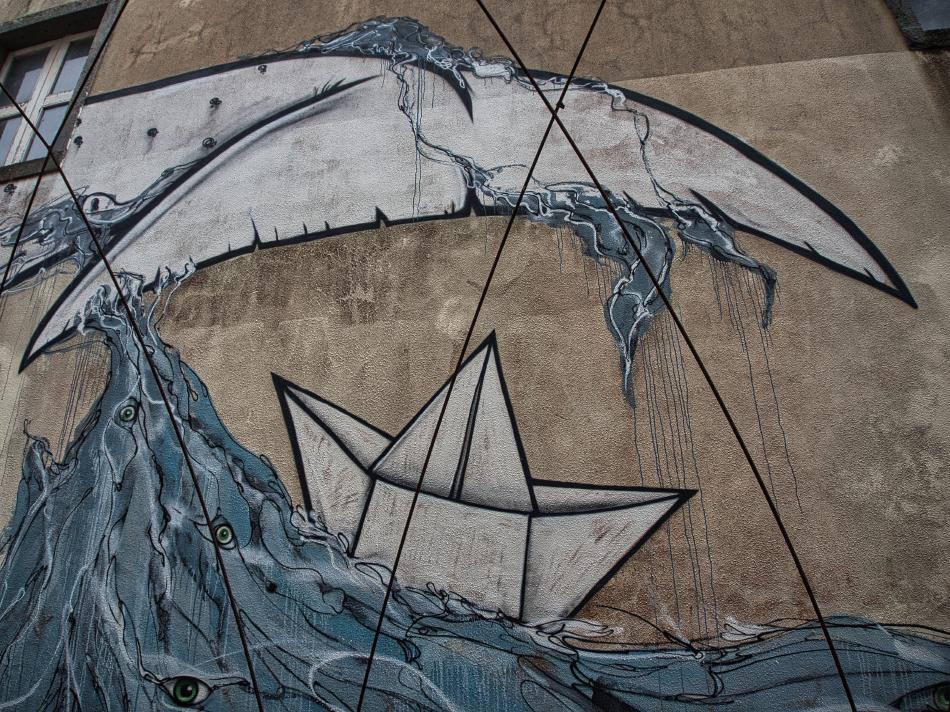 Wenige Meter von unserem Parkplatz führte ein Weg in Richtung Innenstadt – zufälligerweise genau einer der Wege, die Laura im Vorfeld als Must-See-Streetart-Kulisse herausgesucht hatte: die Travessa do Arco, an der viele hohe Bögen aufgestellt sind und ein riesiges Kunstwerk, das einen Wal mit einem Papierboot im Wasser zeigt, eine Hauswand ziert.