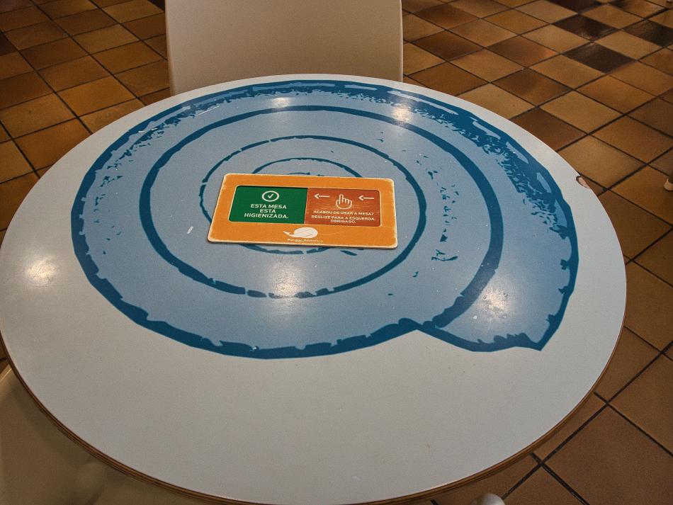 Neben den Toiletten war hier oben auch die Fressmeile der Mall. Es gab ziemlich viele sehr gut aussehende kleine Theken, von denen man sich sein Essen holen konnte, um es in einer großen Tischsammlung in der Mitte zu verzehren. Um einigermaßen Corona-Hygienemaßnahmen umzusetzen, war hier in der Mitte jeder Tisch mit einem Papp-Schieber bestückt, der anzeigte, ob der Tisch gerade benutzt und dreckig oder frisch desinfiziert war. Das war ein richtig gutes Konzept!