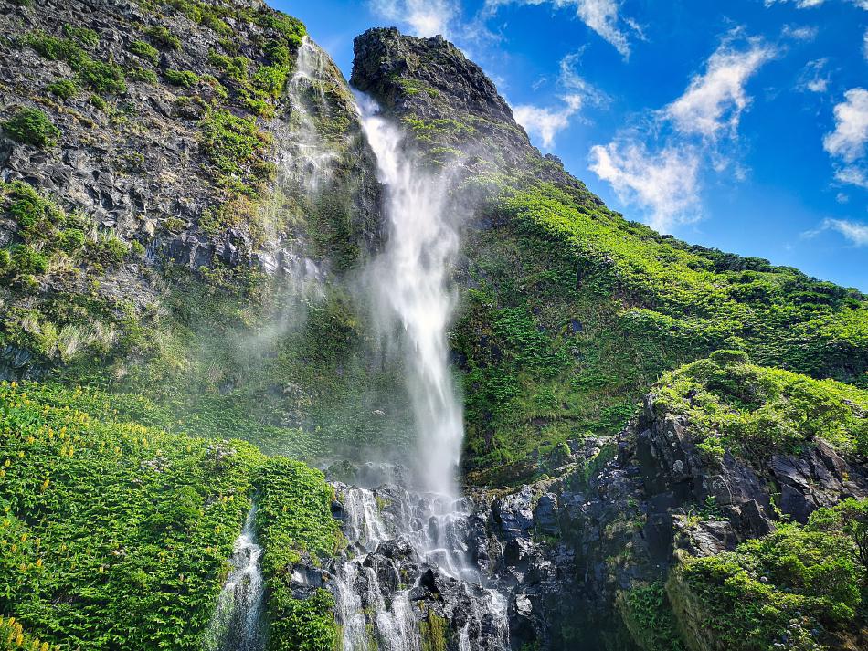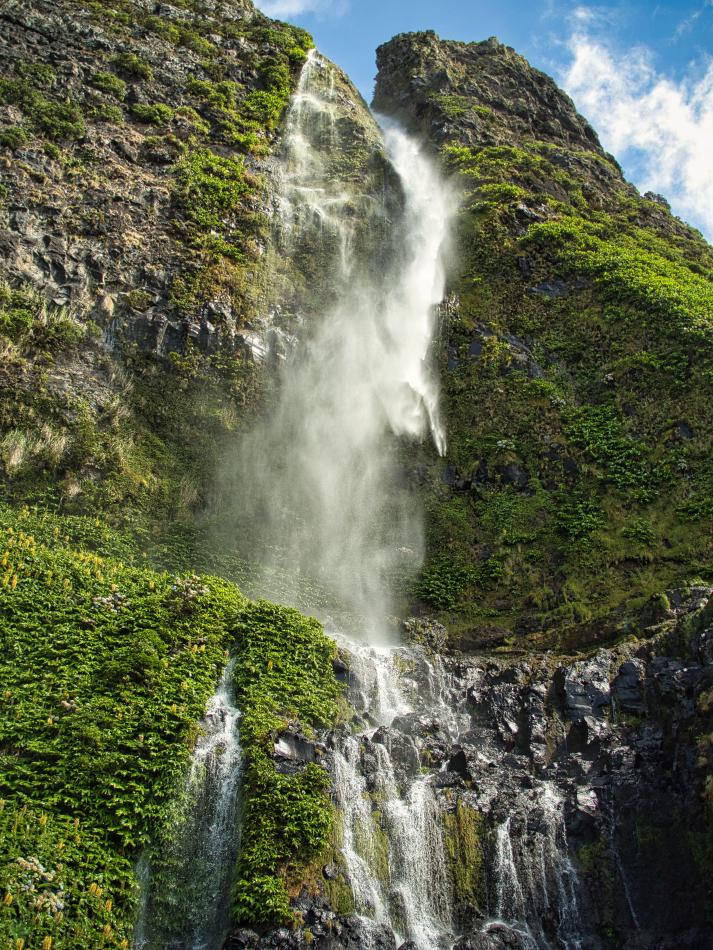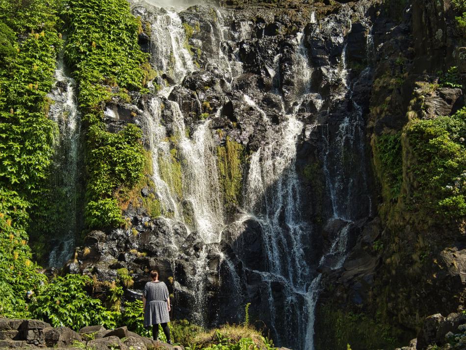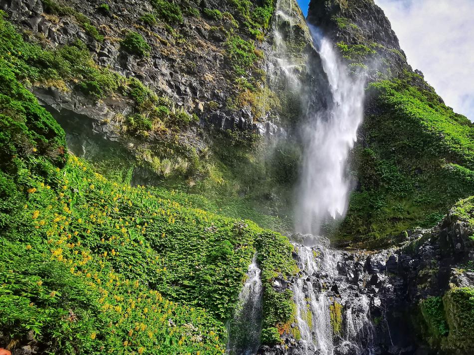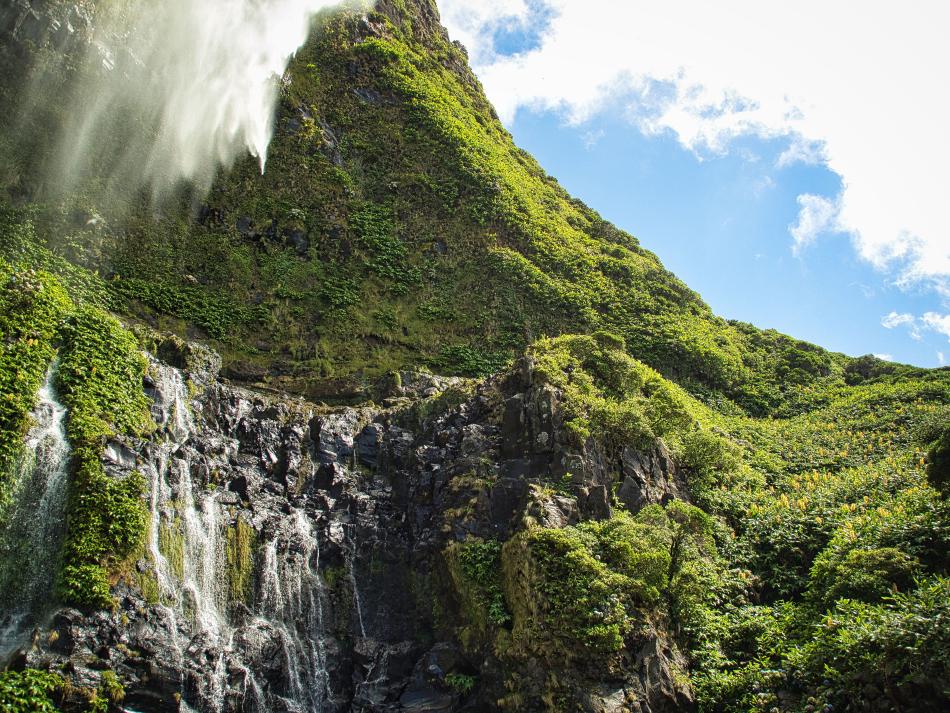 Auf dem Weg über die Ebene auf dem Berg merkten wir schnell, wie sich das Wetter verbesserte. Auf den beiden Inselseiten ist das Wetter meist ziemlich unterschiedlich, sodass wir am Nachmittag noch echt Glück hatten und ein bisschen die Sonne genießen konnten. Vom Bergpass aus mussten wir noch ein Stück der Straße im Westen in Richtung Norden folgen. Der Weg hier ist ein Traum. So weit das Auge reicht gibt es hier Blüten zu sehen – meist kräftig gelben Schmetterlingsingwer aber auch sehr viel Hortensien. Und je tiefer man fährt, desto beeindruckender sind die Felswände, die man in der Ferne erspähen kann. An diesen Felswänden kann man sogar schon einige Wasserfälle erkennen.