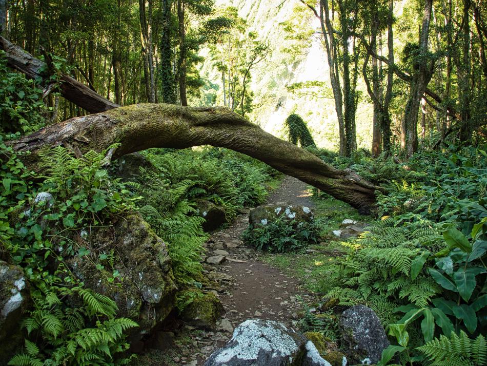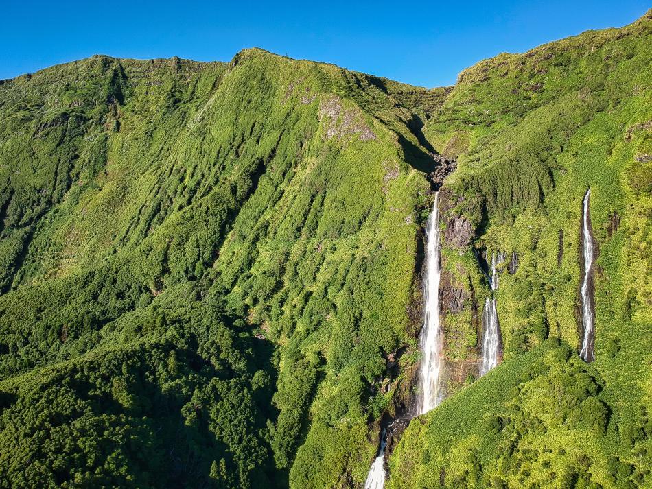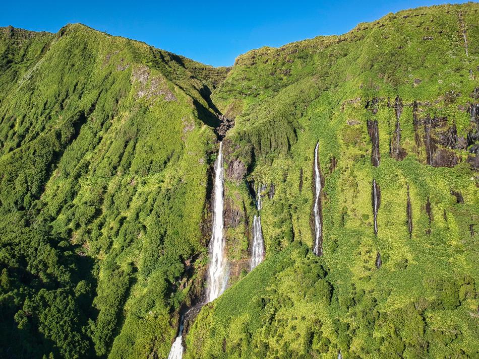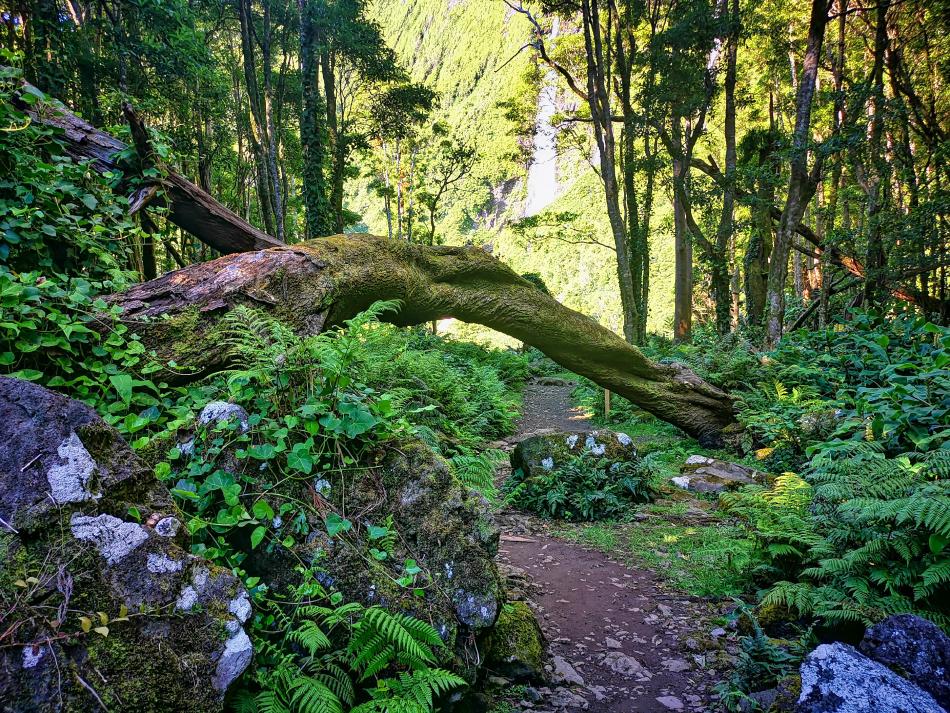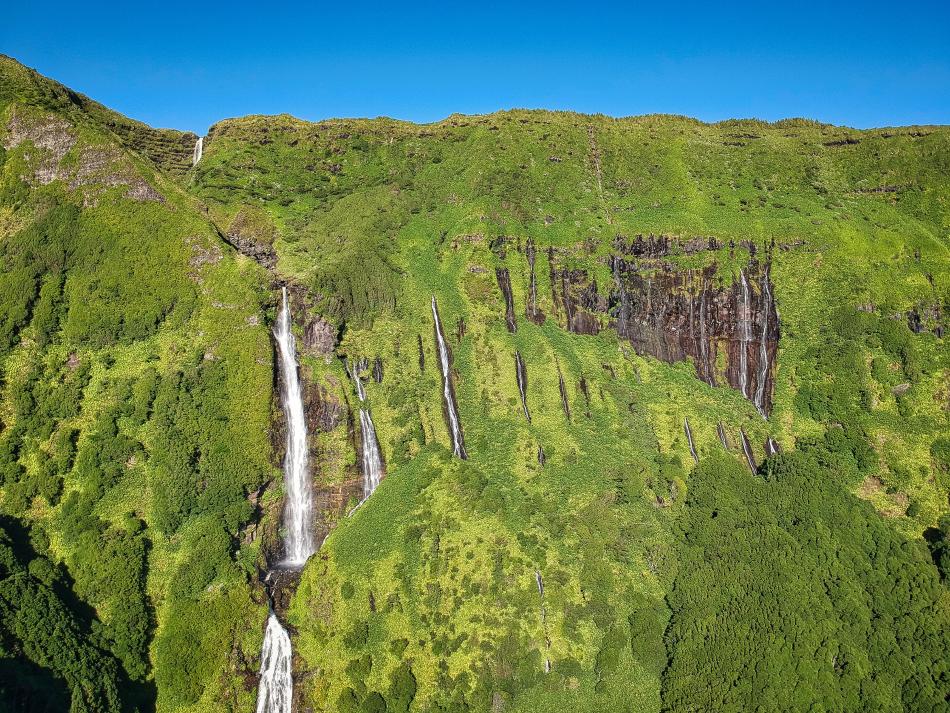 Auf dem Weg über die Ebene auf dem Berg merkten wir schnell, wie sich das Wetter verbesserte. Auf den beiden Inselseiten ist das Wetter meist ziemlich unterschiedlich, sodass wir am Nachmittag noch echt Glück hatten und ein bisschen die Sonne genießen konnten. Vom Bergpass aus mussten wir noch ein Stück der Straße im Westen in Richtung Norden folgen. Der Weg hier ist ein Traum. So weit das Auge reicht gibt es hier Blüten zu sehen – meist kräftig gelben Schmetterlingsingwer aber auch sehr viel Hortensien. Und je tiefer man fährt, desto beeindruckender sind die Felswände, die man in der Ferne erspähen kann. An diesen Felswänden kann man sogar schon einige Wasserfälle erkennen.