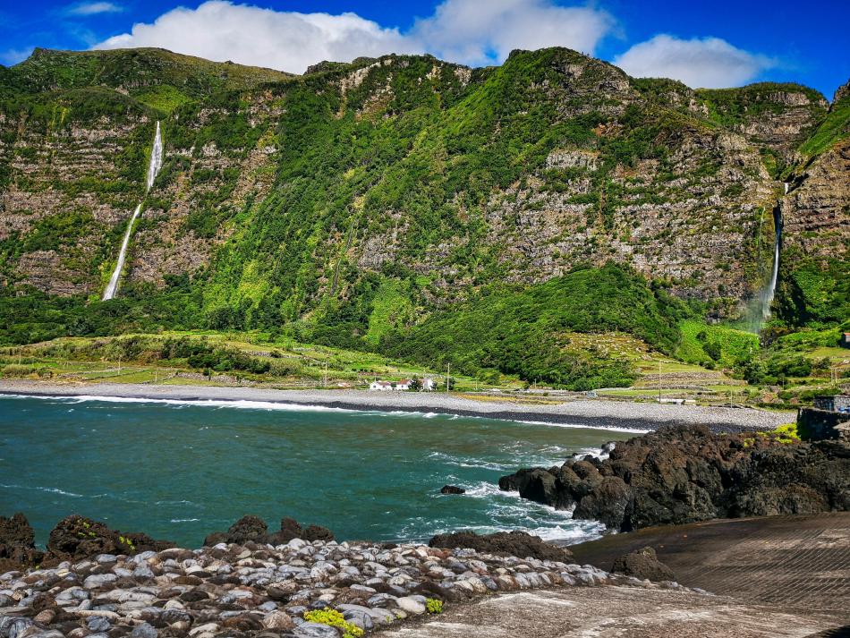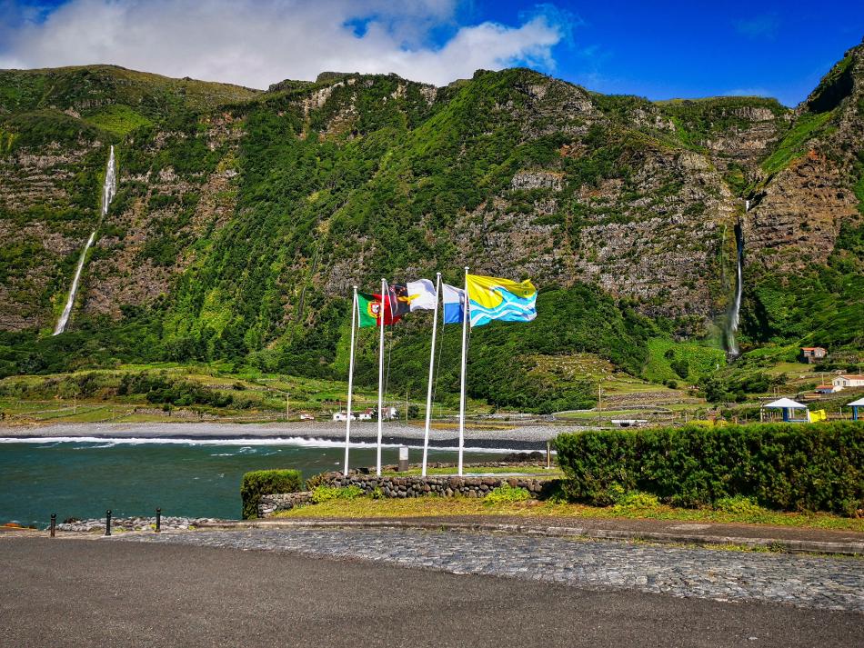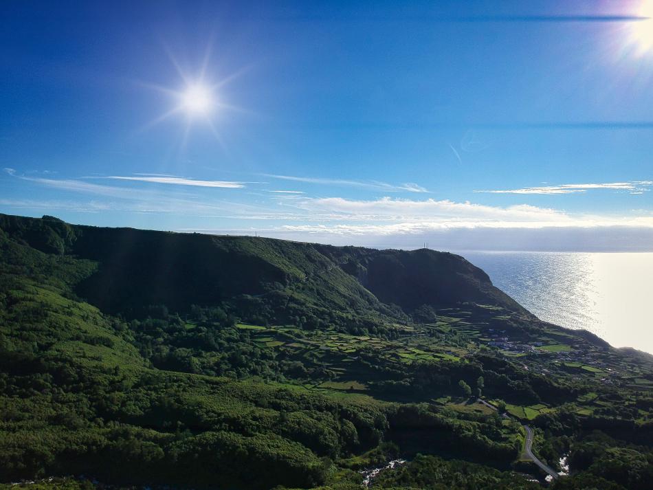 Als wir genug der magischen Atmosphäre hier im saftigen Grün unterhalb des Wasserfalls eingeatmet hatten, haben wir uns wieder auf den Rückweg zum Auto gemacht. Da wir schon ein paar Autos die Straße weiter fahren sehen haben, haben wir uns kurzerhand entschieden, den weiteren Teil der Insel hier am Anfang des Nirgendwos noch weiter zu erkunden. In der Ferne konnten wir nämlich noch den letzten Ort, Ponta da Faja , der sich hier im Westen befindet erkennen. Hinter der langgezogenen Bucht, konnten wir schon von der Straße am Wasserfall aus die Kirche des Dorfes erkennen.