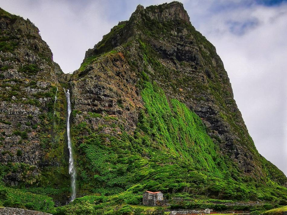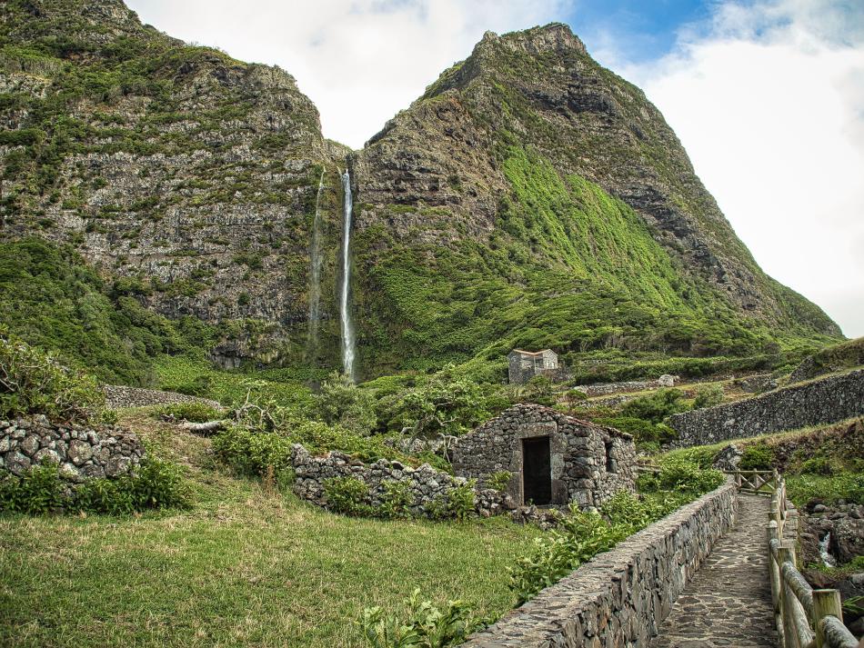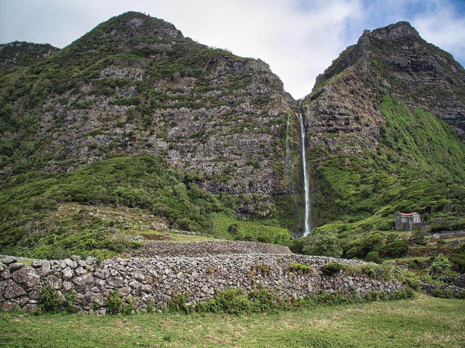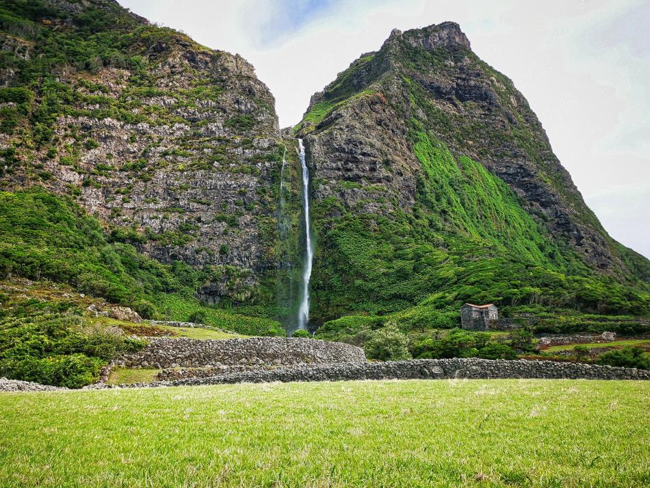 Unsere Unterkunft lag kurz vor dem kleinen Örtchen Fajã Grande, an dessen nördlichem Ende ein hübscher Wasserfall liegt. Dieser Wasserfall sollte, so unser frisch geschmiedeter Plan, unser erstes Ziel auf der Insel sein. Mit dem Auto sind wir deshalb in Richtung Fajã Grande von unserer Unterkunft los gefahren. Der Ort selbst ist wirklich klein und macht einen tollen dörflichen Eindruck. Viel von dem Ort haben wir aber gar nicht gesehen, es war alles ziemlich neu und eng und wir wollten ja auch unserer Route in Richtung Wasserfall folgen. Hinter dem Ort bleibt die Straße sehr schmal und wir konnten auf der rechten Seite im Berg schon zwei Wasserfälle erkennen. Ein paar Meter weiter gab es auf der linken Seite einen schmalen Parkstreifen, auf dem bereits viel Betrieb war. Wir hatten Glück, dass just in dem Zeitpunkt, als wir hier hin wollten, gerade ein großes Auto vor uns seinen Parkplatz verließ, den wir direkt übernehmen konnten.