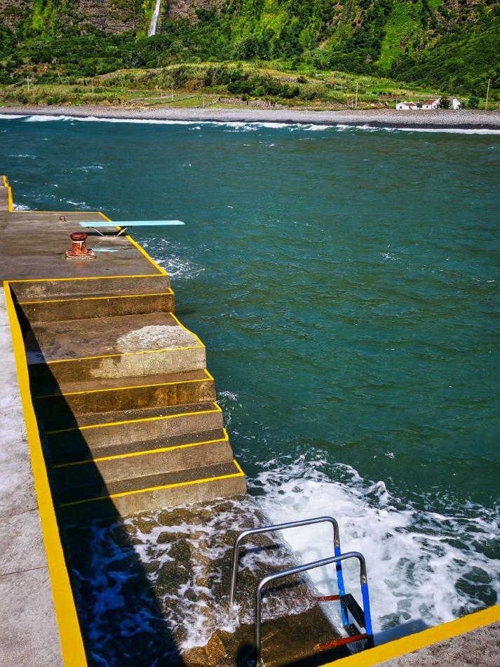 Mit dem Auto konnte man hier erstaunlich gut hin kommen. Alle Straßen hier in der Gegend waren ja ziemlich eng – bis auf diese. Hier am Meer gab es sogar einen richtig großen Parkplatz, auf dem wir unser Auto auch abgestellt haben. Von hier aus konnte man über einen großen asphaltierten Platz bis hin zum betonierten Steg ins Meer hinein laufen. Das “natürliche Schwimmbecken” war auch hier, wie sollte es auch anders sein, das Meer. Sehr cool: es gab sogar ein Sprungbrett ins Wasser!