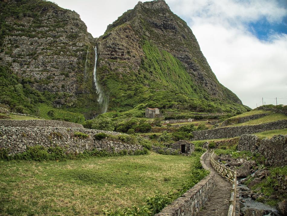 Auf dem Weg zu dem Dorf haben wir uns spontan noch überlegt, dass wir auch noch zum zweiten Wasserfall laufen wollten, weil uns der erste so gut gefallen hat. Irgendwo auf der passenden Höhe haben wir also das Auto wieder abgestellt und sind in Richtung Wasserfall gelaufen. Zwischen Straße und Wasserfall befand sich jedoch die meiste Zeit eine massive Steinmauer und jenseits der Steinmauer (höchstwahrscheinlich) bewirtschaftete Felder. An einigen Stellen gab es jedoch die Möglichkeit, in Gänge zwischen den Steinmauern hineinzulaufen. In einen dieser Gänge sind wir hinein gelaufen, mehr so auf gut Glück. Hier ist alles richtig sauber und gepflegt gewesen. Die Wege hier sind bestimmt eher für die Bauern gemacht, die ihre Felder beschicken müssen, aber auch für uns war das hier ein schöner Weg – nur leider verlief er irgendwie in die falsche Richtung: parallel zur Straße. Nach vielleicht 400 m sind wir wieder umgekehrt und wieder ins Auto eingestiegen. Hat also leider nicht geklappt, auch noch zum zweiten Wasserfall zu kommen.