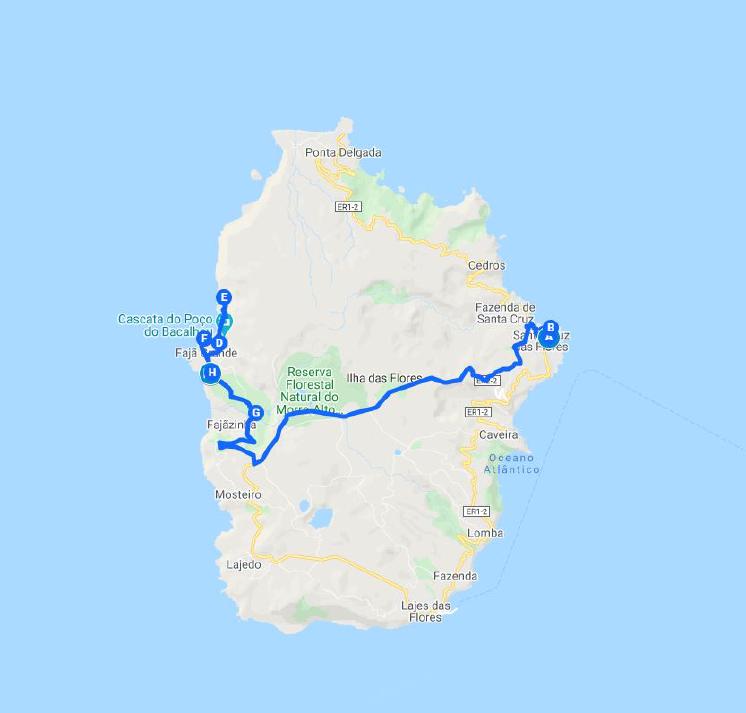 Vom Supermarkt aus hieß es für uns dann ab auf die andere Seite der Insel. Der Flughafen befindet sich ganz im Osten der Insel, in der Hauptstadt Santa Cruz das Flores und unsere Unterkunft lag ganz im Westen, in der Stadt Fajã Grande. Flores ist aber nicht so groß, sodass der Weg von Santa Cruz das Flores bis nach Fajã Grande in guten 20 Minuten zu schaffen ist.