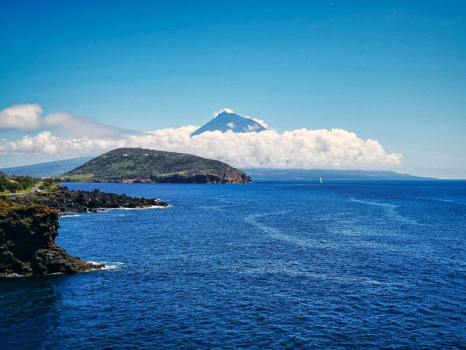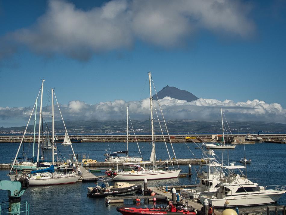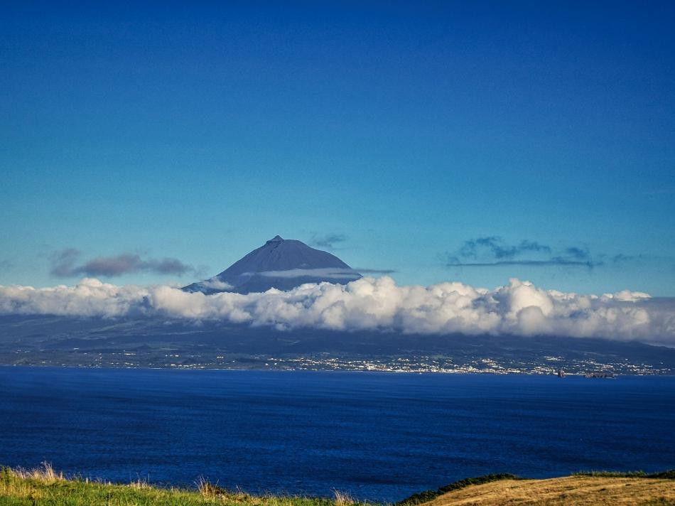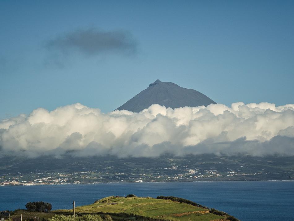 Auf dem knapp 10 km langen Weg von unserer Unterkunft nach Horta konnten wir zu unserer linken im Süden konstant ziemlich gut die Insel Pico sehen. Der Pico, so heißt der große Berg auf der zu sehenden Insel, war an diesem Tag voll unter einer Wolkendecke begraben, nur die Spitze des Berges ragte aus dem Nebel empor.