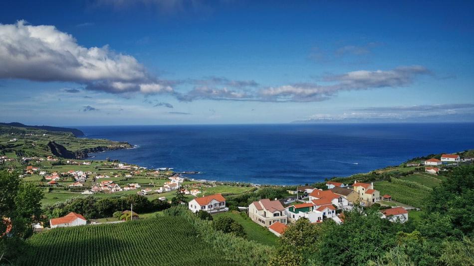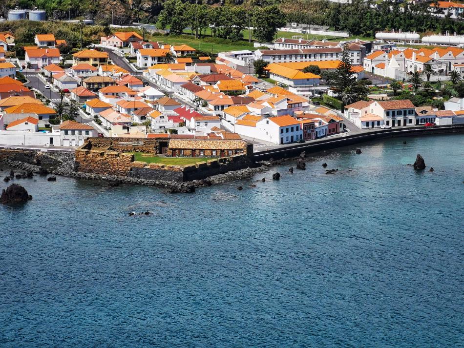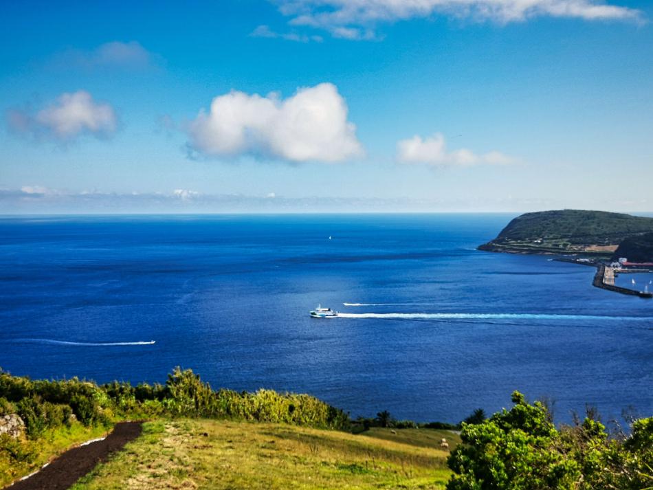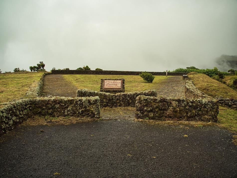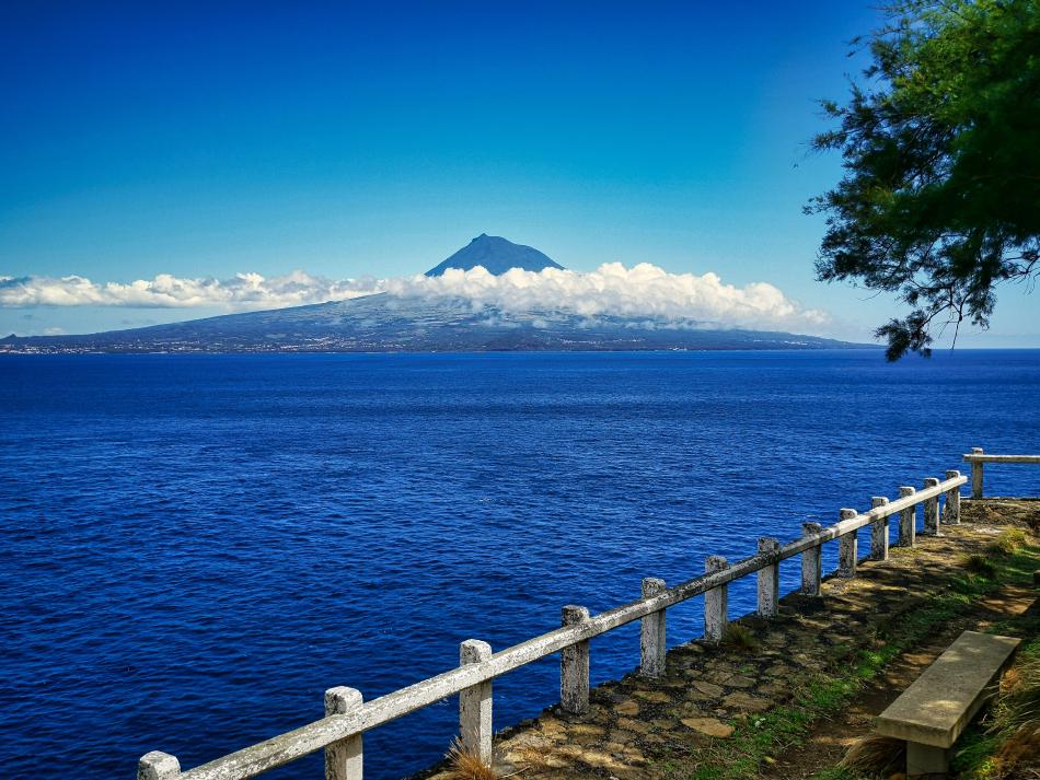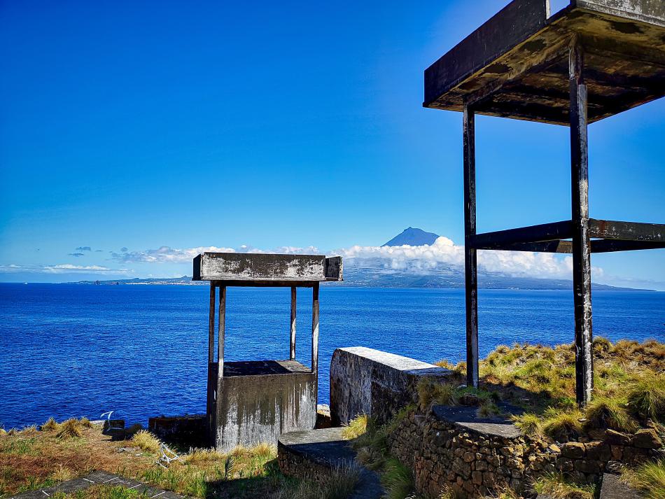 Der erste kleine Stopp auf dem Berg ist das Forte da Greta. Irgendwie heißen alle Forts auf den Azoren gleich; vielleicht deswegen trägt dieses Fort aber (zumindest bei Google Maps) auch den Namen Forte de Nossa Senhora da Guia. Das Fort hat heutzutage den Titel Fort kaum noch verdient – trotzdem kann man hier ganz gut anhalten. Von hier hat man einen tollen Blick aufs blaue Meer. Wir hatten an diesem Tag auch unfassbar viel Glück mit dem Wetter, sodass das Wasser hier auch wirklich tiefblau war. Über das Meer hatten wir auch einen super Blick auf die Insel Pico und konnten sogar die Bebauung der Hafenstadt Madalena erahnen. Die Stadt ist mit 8 km wirklich nicht weit entfernt und mit der tollen Sicht, die wir hatten, konnte man fast Häuser zählen.